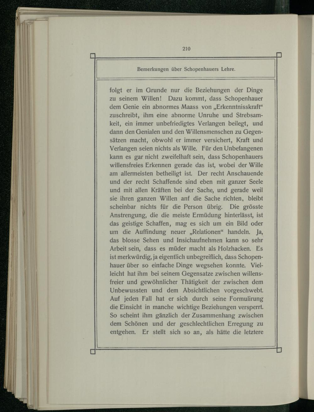folgt er im Grunde nur die Beziehungen der Dinge zu seinem Willen! Dazu kommt, dass Schopenhauer dem Genie ein abnormes Maass von„Erkenntnisskraft“ zuschreibt, ihm eine abnorme Unruhe und Strebsamkeit, ein immer unbefriedigtes Verlangen beilegt, und dann den Genialen und den Willensmenschen zu Gegensätzen macht, obwohl er immer versichert, Kraft und Verlangen seien nichts als Wille. Für den Unbefangenen kann es gar nicht zweifelhaft sein, dass Schopenhauers willensfreies Erkennen gerade das ist, wobei der Wille am allermeisten betheiligt ist. Der recht Anschauende und der recht Schaffende sind eben mit ganzer Seele und mit allen Kräften bei der Sache, und gerade weil sie ihren ganzen Willen anf die Sache richten, bleibt scheinbar nichts für die Person übrig. Die grösste Anstrengung, die die meiste Ermüdung hinterlässt, ist das geistige Schaffen, mag es sich um ein Bild oder um die Auffindung neuer„Relationen“ handeln. Ja, das blosse Sehen und Insichaufnehmen kann so sehr Arbeit sein, dass es müder macht als Holzhacken. Es ist merkwürdig, ja eigentlich unbegreiflich, dass Schopenhauer über so einfache Dinge wegsehen konnte. Vielleicht hat ihm bei seinem Gegensatze zwischen willensfreier und gewöhnlicher Thätigkeit der zwischen dem Unbewussten und dem Absichtlichen vorgeschwebt. Auf jeden Fall hat er sich durch seine Formulirung die Einsicht in manche wichtige Beziehungen versperrt. So scheint ihm gänzlich der Zusammenhang zwischen dem Schönen und der geschlechtlichen Erregung zu entgehen. Er stellt sich so an, als hätte die letztere