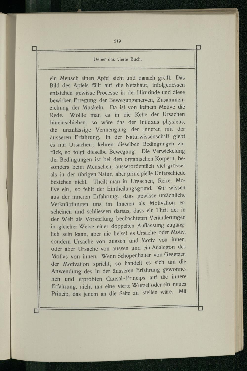 ein Mensch einen Apfel sieht und danach greift. Das Bild des Apfels fällt auf die Netzhaut, infolgedessen entstehen gewisse Processe in der Hirnrinde und diese bewirken Erregung der Bewegungsnerven, Zusammenziehung der Muskeln. Da ist von keinem Motive die Rede. Wollte man es in die Kette der Ursachen hineinschieben, so wäre das der Influxus physicus, die unzulässige Vermengung der inneren mit der äusseren Erfahrung. In der Naturwissenschaft giebt es nur Ursachen; kehren dieselben Bedingungen Zzurück, so folgt dieselbe Bewegung. Die Verwickelung der Bedingungen ist bei den organischen Körpern, besonders beim Menschen, ausserordentlich viel grösser als in der übrigen Natur, aber principielle Unterschiede bestehen nicht. Theilt man in Ursachen, Reize, Motive ein, so fehlt der Eintheilungsgrund. Wir wissen aus der inneren Erfahrung, dass gewisse ursächliche Verknüpfungen uns im Inneren als Motivation erscheinen und schliessen daraus, dass ein Theil der in der Welt als Vorstellung beobachteten Veränderungen in gleicher Weise einer doppelten Auffassung zugänglich sein kann, aber nie heisst es Ursache oder Motiv, sondern Ursache von aussen und Motiv von innen, oder aber Ursache von aussen und ein Analogon des Motivs von innen. Wenn Schopenhauer von Gesetzen der Motivation spricht, so handelt es sich um die Anwendung des in der äusseren Erfahrung gewonnenen und erprobten Causal- Princips auf die innere Erfahrung, nicht um eine vierte Wurzel oder ein neues Princip, das jenem an die Seite zu stellen wäre. Mit