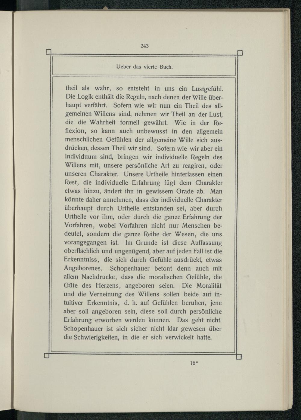 theil als wahr, so entsteht in uns ein Lustgefühl. Die Logik enthält die Regeln, nach denen der Wille überhaupt verfährt. Sofern wie wir nun ein Theil des allgemeinen Willens sind, nehmen wir Theil an der Lust, die die Wahrheit formell gewährt. Wie in der Reflexion, so kann auch unbewusst in den allgemein menschlichen Gefühlen der allgemeine Wille sich ausdrücken, dessen Theil wir sind. Sofern wie wir aber ein Individuum sind, bringen wir individuelle Regeln des Willens mit, unsere persönliche Art zu reagiren, oder unseren Charakter. Unsere Urtheile hinterlassen einen Rest, die individuelle Erfahrung fügt dem Charakter etwas hinzu, ändert ihn in gewissem Grade ab. Man könnte daher annehmen, dass der individuelle Charakter überhaupt durch Urtheile entstanden sei, aber durch Urtheile vor ihm, oder durch die ganze Erfahrung der Vorfahren, wobei Vorfahren nicht nur Menschen bedeutet, sondern die ganze Reihe der Wesen, die uns vorangegangen ist. Im Grunde ist diese Auffassung oberflächlich und ungenügend, aber auf jeden Fall ist die Erkenntniss, die sich durch Gefühle ausdrückt, etwas Angeborenes. Schopenhauer betont denn auch mit allem Nachdrucke, dass die moralischen Gefühle, die Güte des Herzens, angeboren seien. Die Moralität und die Verneinung des Willens sollen beide auf intuitiver Erkenntnis, d. h. auf Gefühlen beruhen, jene aber soll angeboren sein, diese soll durch persönliche Erfahrung erworben werden können. Das geht nicht. Schopenhauer ist sich sicher nicht klar gewesen über die Schwierigkeiten, in die er sich verwickelt hatte.