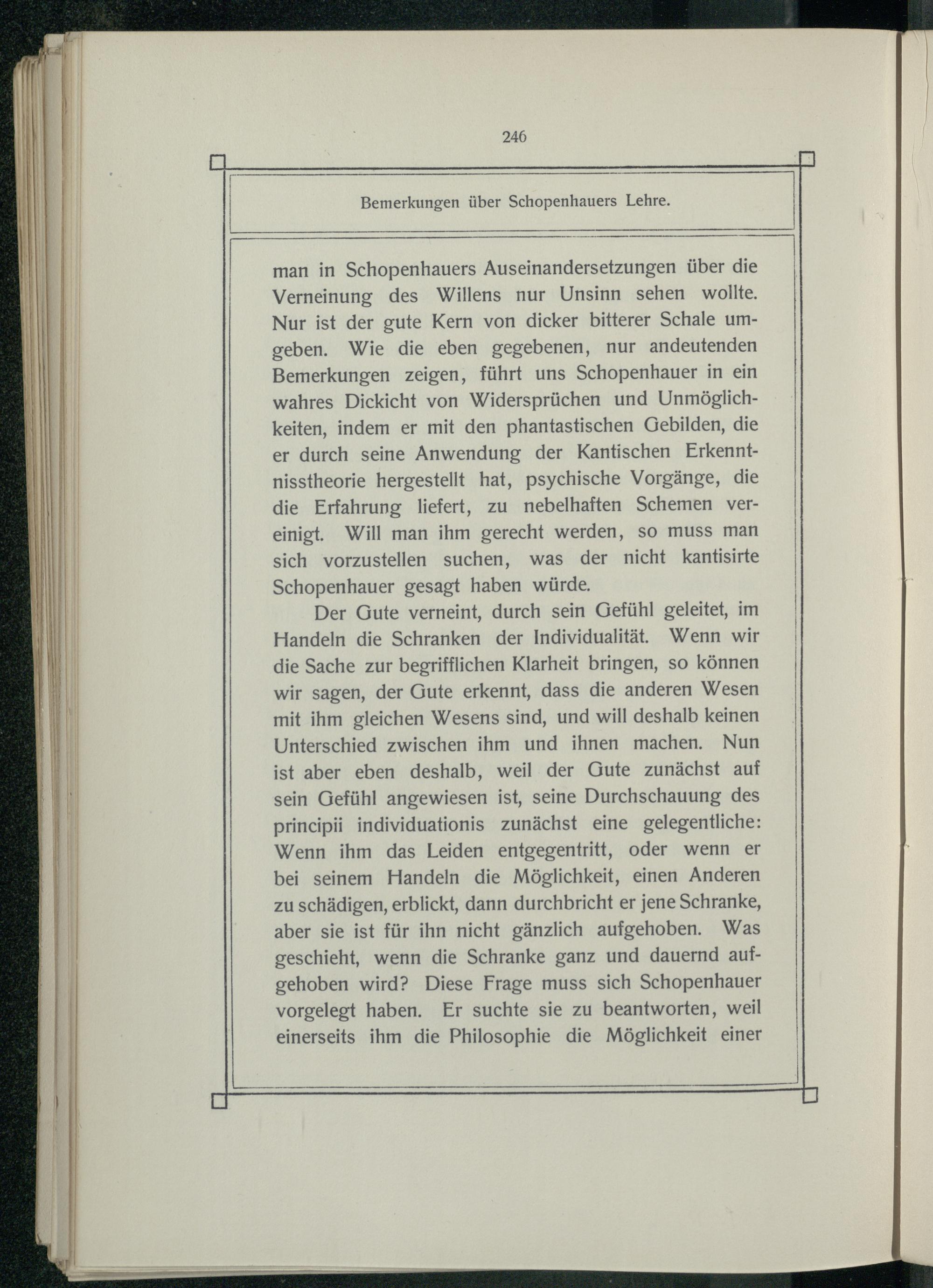 man in Schopenhauers Auseinandersetzungen über die Verneinung des Willens nur Unsinn sehen wollte, Nur ist der gute Kern von dicker bitterer Schale umgeben. Wie die eben gegebenen, nur andeutenden Bemerkungen zeigen, führt uns Schopenhauer in ein wahres Dickicht von Widersprüchen und Unmöglichkeiten, indem er mit den phantastischen Gebilden, die er durch seine Anwendung der Kantischen Erkenntnisstheorie hergestellt hat, psychische Vorgänge, die die Erfahrung liefert, zu nebelhaften Schemen vereinigt. Will man ihm gerecht werden, so muss man sich vorzustellen suchen, was der nicht kantisirte Schopenhauer gesagt haben würde.