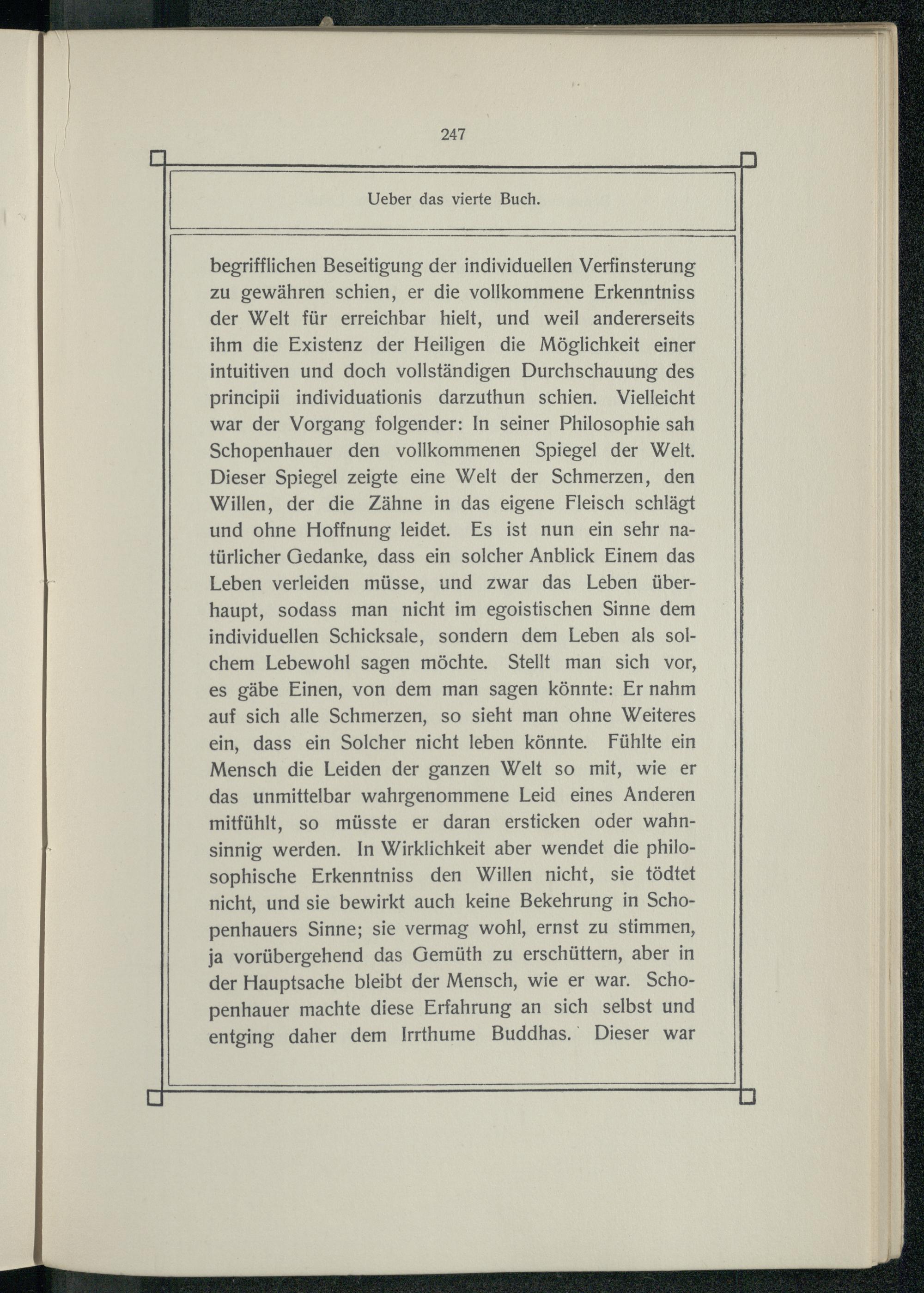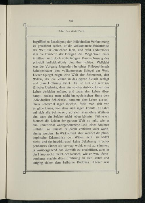 begrifflichen Beseitigung der individuellen Verfinsterung zu gewähren schien, er die vollkommene Erkenntniss der Welt für erreichbar hielt, und weil andererseits ihm die Existenz der Heiligen die Möglichkeit einer intuitiven und doch vollständigen Durchschauung des principii individuationis darzuthun schien. Vielleicht war der Vorgang folgender: In seiner Philosophie sah Schopenhauer den vollkommenen Spiegel der Welt. Dieser Spiegel zeigte eine Welt der Schmerzen, den Willen, der die Zähne in das eigene Fleisch schlägt und ohne Hoffnung leidet. Es ist nun ein sehr natürlicher Gedanke, dass ein solcher Anblick Einem das Leben verleiden müsse, und zwar das Leben überhaupt, sodass man nicht im egoistischen Sinne dem individuellen Schicksale, sondern dem Leben als solchem Lebewohl sagen möchte. Stellt man sich vor, es gäbe Einen, von dem man sagen könnte: Er nahm auf sich alle Schmerzen, so sieht man ohne Weiteres ein, dass ein Solcher nicht leben könnte. Fühlte ein Mensch die Leiden der ganzen Welt so mit, wie er das unmittelbar wahrgenommene Leid eines Anderen mitfühlt, so müsste er daran ersticken oder wahnsinnig werden. In Wirklichkeit aber wendet die philosophische Erkenntniss den Willen nicht, sie tödtet nicht, und sie bewirkt auch keine Bekehrung in Schopenhauers Sinne; sie vermag wohl, ernst zu stimmen, ja vorübergehend das Gemüth zu erschüttern, aber in der Hauptsache bleibt der Mensch, wie er war. Schopenhauer machte diese Erfahrung an sich selbst und entging daher dem Irrthume Buddhas.‘ Dieser war