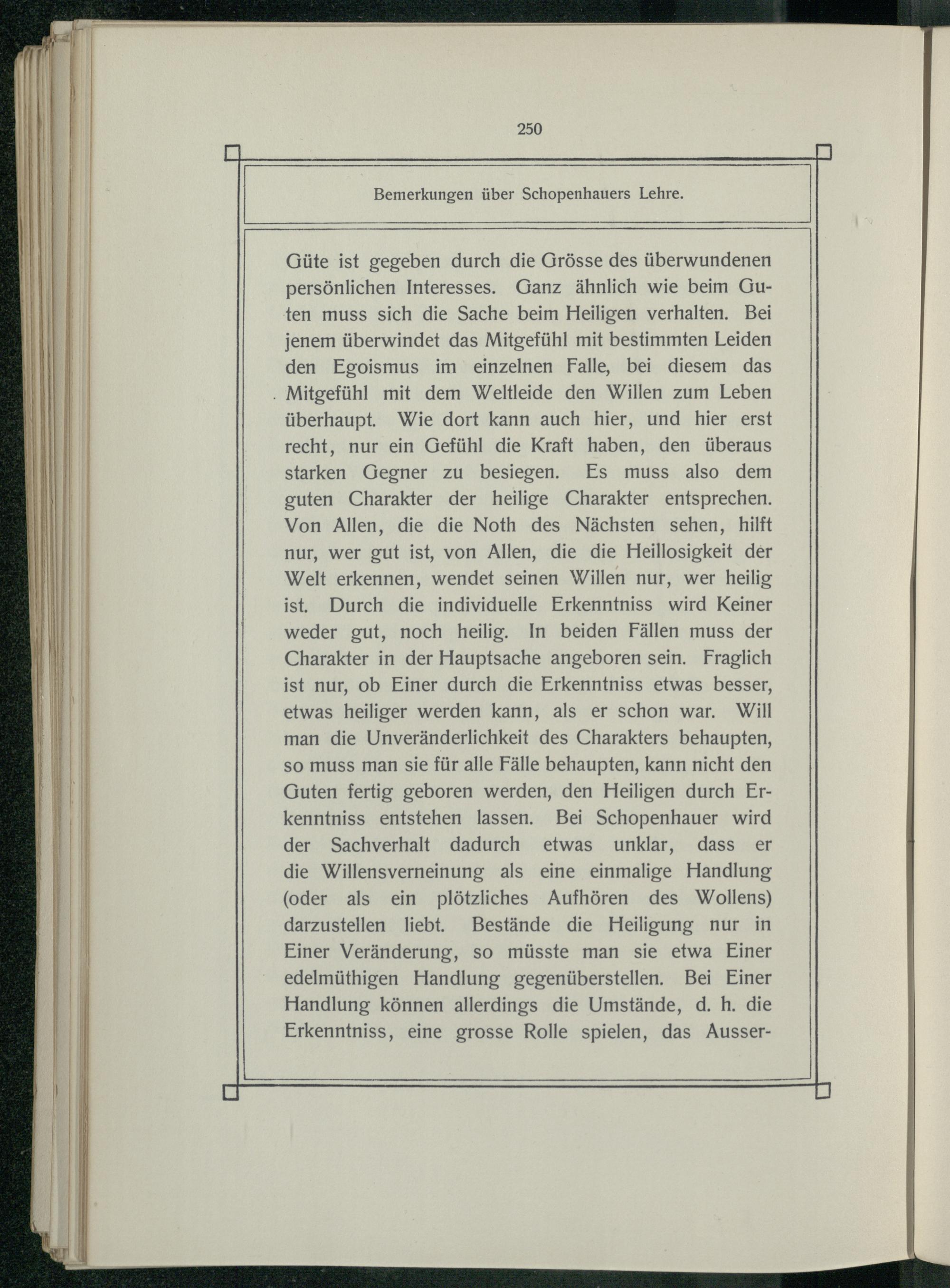 Güte ist gegeben durch die Grösse des überwundenen persönlichen Interesses. Ganz ähnlich wie beim Guten muss sich die Sache beim Heiligen verhalten. Bei jenem überwindet das Mitgefühl mit bestimmten Leiden den Egoismus im einzelnen Falle, bei diesem das . Mitgefühl mit dem Weltleide den Willen zum Leben überhaupt. Wie dort kann auch hier, und hier erst recht, nur ein Gefühl die Kraft haben, den überaus starken Gegner zu besiegen. Es muss also dem guten Charakter der heilige Charakter entsprechen. Von Allen, die die Noth des Nächsten sehen, hilft nur, wer gut ist, von Allen, die die Heillosigkeit der Welt erkennen, wendet seinen Willen nur, wer heilig ist. Durch die individuelle Erkenntniss wird Keiner weder gut, noch heilig. In beiden Fällen muss der Charakter in der Hauptsache angeboren sein. Fraglich ist nur, ob Einer durch die Erkenntniss etwas besser, etwas heiliger werden kann, als er schon war. Will man die Unveränderlichkeit des Charakters behaupten, so muss man sie für alle Fälle behaupten, kann nicht den Guten fertig geboren werden, den Heiligen durch Erkenntniss entstehen lassen. Bei Schopenhauer wird der Sachverhalt dadurch etwas unklar, dass er die Willensverneinung als eine einmalige Handlung (oder als ein plötzliches Aufhören des Wollens) darzustellen liebt. Bestände die Heiligung nur in Einer Veränderung, so müsste man sie etwa Einer edelmüthigen Handlung gegenüberstellen. Bei Einer Handlung können allerdings die Umstände, d. h. die Erkenntniss, eine grosse Rolle spielen, das Ausser