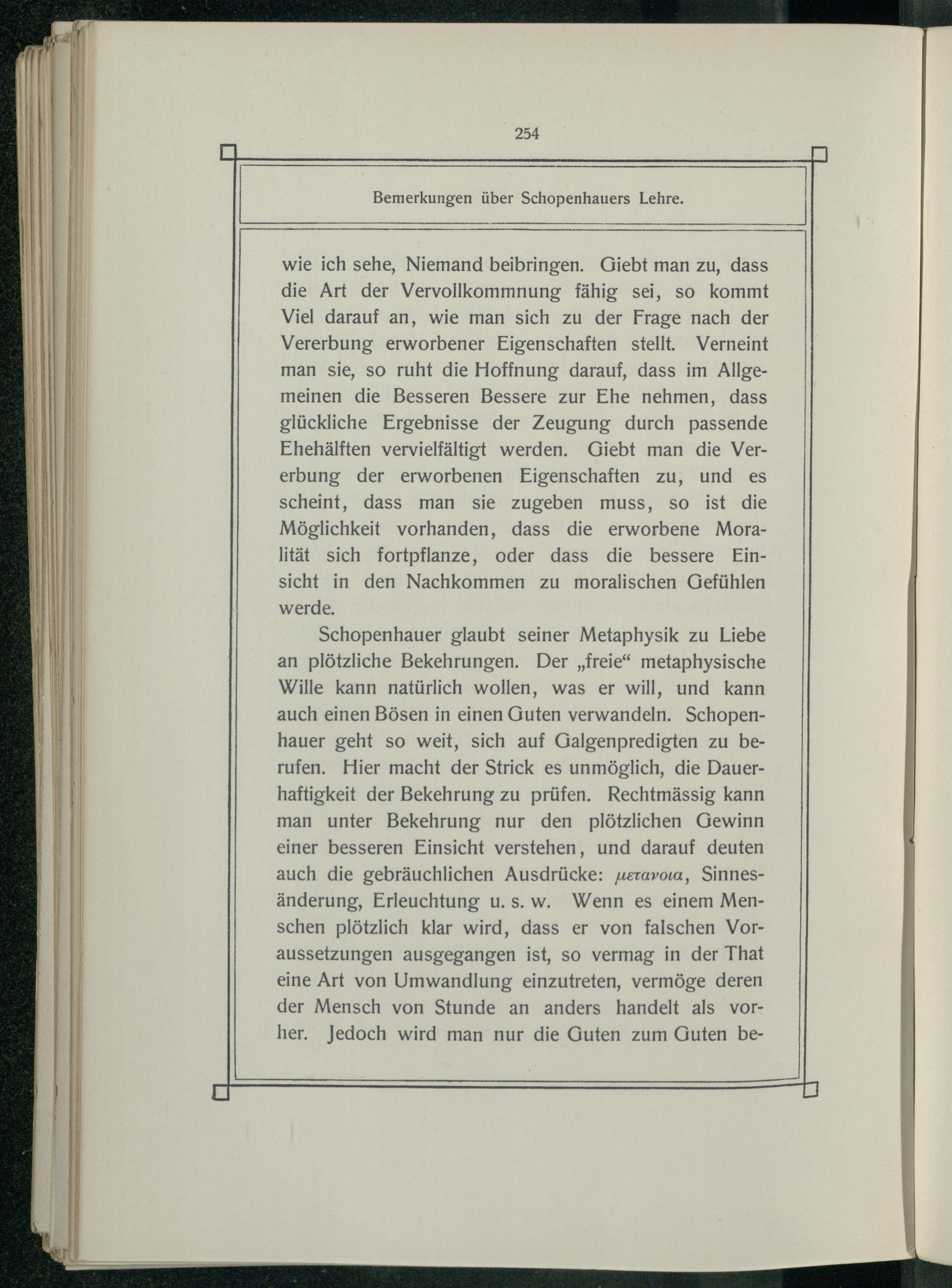 Schopenhauer glaubt seiner Metaphysik zu Liebe an plötzliche Bekehrungen. Der„freie“ metaphysische Wille kann natürlich wollen, was er will, und kann auch einen Bösen in einen Guten verwandeln. Schopenhauer geht so weit, sich auf Galgenpredigten zu berufen. Hier macht der Strick es unmöglich, die Dauerhaftigkeit der Bekehrung zu prüfen. Rechtmässig kann man unter Bekehrung nur den plötzlichen Gewinn einer besseren Einsicht verstehen, und darauf deuten auch die gebräuchlichen Ausdrücke: ueravoıa, Sinnesänderung, Erleuchtung u. s. w. Wenn es einem Menschen plötzlich klar wird, dass er von falschen Voraussetzungen ausgegangen ist, so vermag in der That eine Art von Umwandlung einzutreten, vermöge deren der Mensch von Stunde an anders handelt als vorher. Jedoch wird man nur die Guten zum Guten be