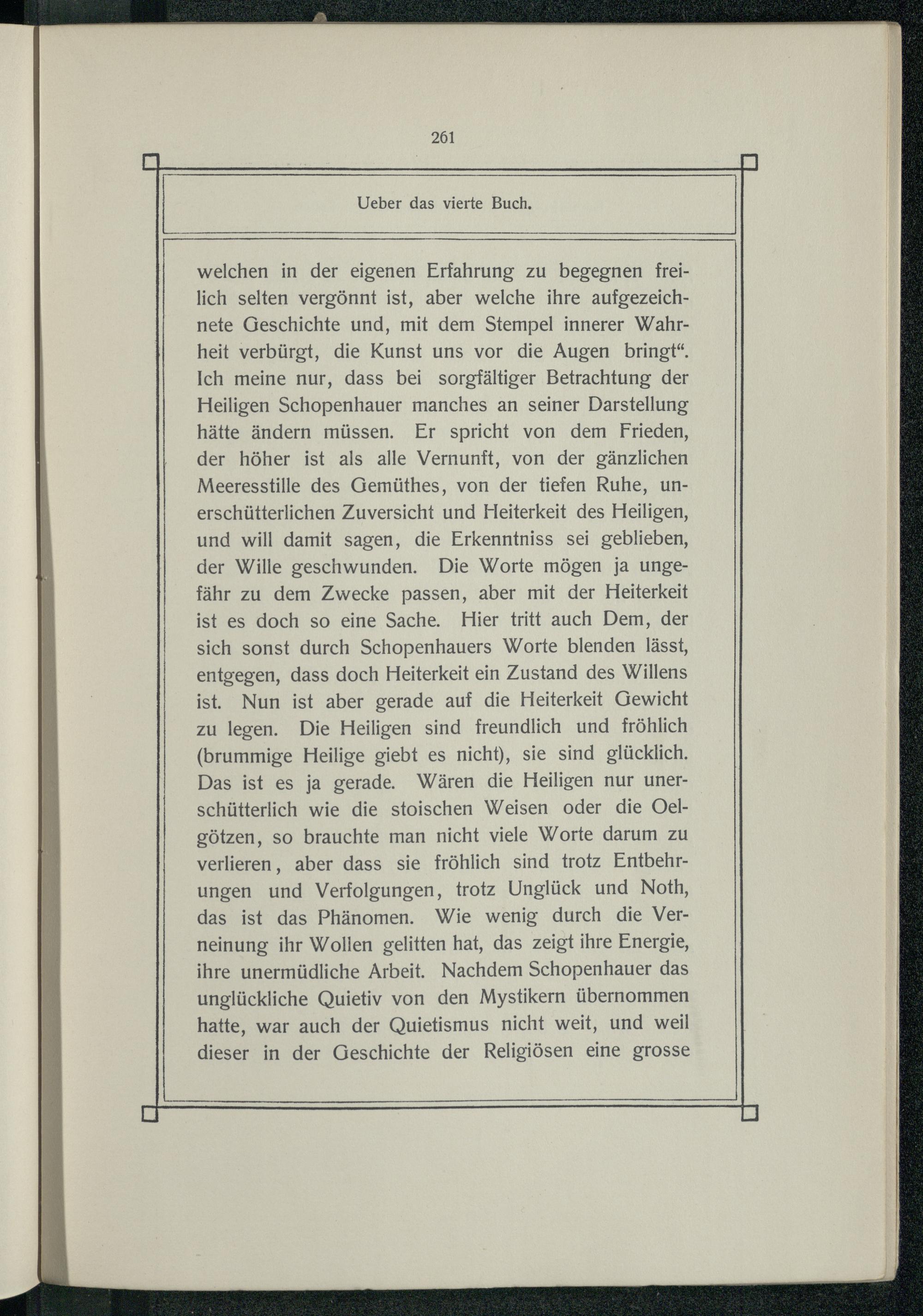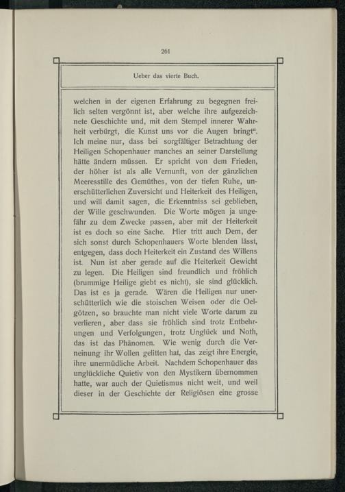 welchen in der eigenen Erfahrung zu begegnen freilich selten vergönnt ist, aber welche ihre aufgezeichnete Geschichte und, mit dem Stempel innerer Wahrheit verbürgt, die Kunst uns vor die Augen bringt“. Ich meine nur, dass bei sorgfältiger Betrachtung der Heiligen Schopenhauer manches an seiner Darstellung hätte ändern müssen. Er spricht von dem Frieden, der höher ist als alle Vernunft, von der gänzlichen Meeresstille des Gemüthes, von der tiefen Ruhe, unerschütterlichen Zuversicht und Heiterkeit des Heiligen, und will damit sagen, die Erkenntniss sei geblieben, der Wille geschwunden. Die Worte mögen ja ungefähr zu dem Zwecke passen, aber mit der Heiterkeit ist es doch so eine Sache. Hier tritt auch Dem, der sich sonst durch Schopenhauers Worte blenden lässt, entgegen, dass doch Heiterkeit ein Zustand des Willens ist. Nun ist aber gerade auf die Heiterkeit Gewicht zu legen. Die Heiligen sind freundlich und fröhlich (brummige Heilige giebt es nicht), sie sind glücklich. Das ist es ja gerade. Wären die Heiligen nur unerschütterlich wie die stoischen Weisen oder die Oelgötzen, so brauchte man nicht viele Worte darum zu verlieren, aber dass sie fröhlich sind trotz Entbehrungen und Verfolgungen, trotz Unglück und Noth, das ist das Phänomen. Wie wenig durch die Verneinung ihr Wollen gelitten hat, das zeigt ihre Energie, ihre unermüdliche Arbeit. Nachdem Schopenhauer das unglückliche Quietiv von den Mystikern übernommen hatte, war auch der Quietismus nicht weit, und weil dieser in der Geschichte der Religiösen eine grosse