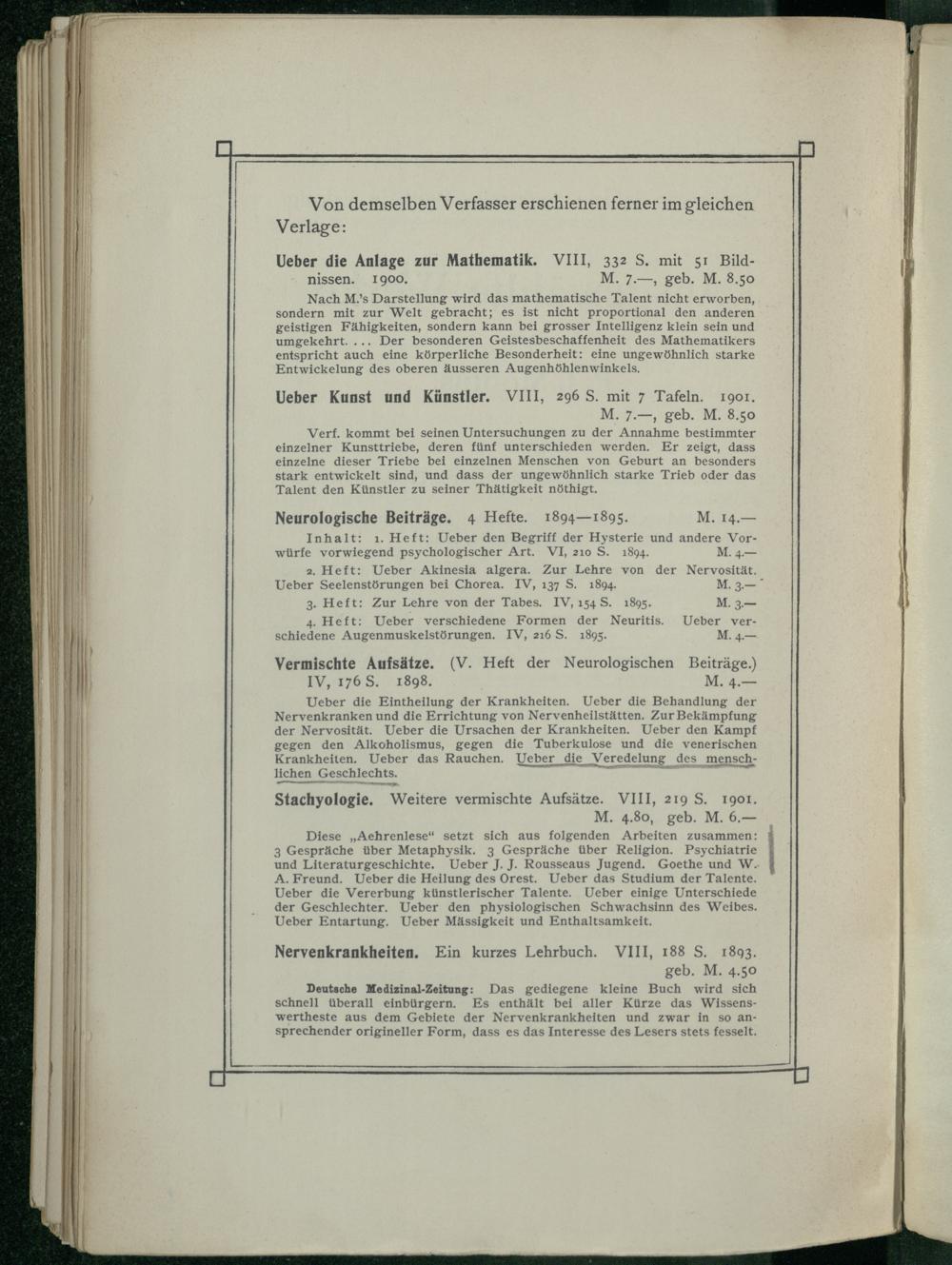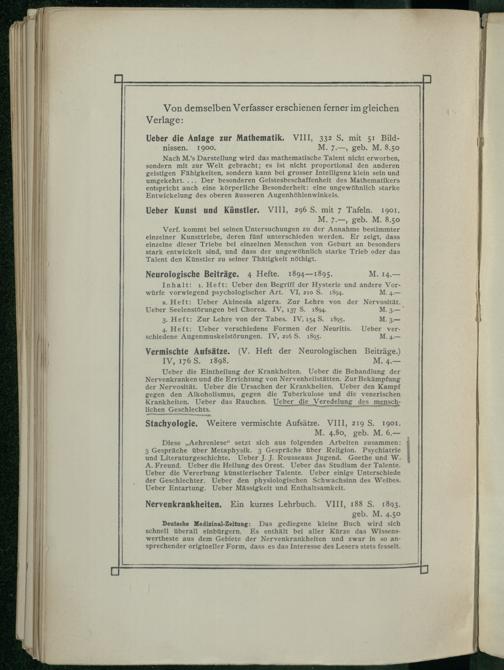 Ueber die Anlage zur Mathematik. VIII, 332 S. mit 51 Bildnissen. 1900. M. 7.—, geb. M. 8.50 Nach M.’s Darstellung wird das mathematische Talent nicht erworben,