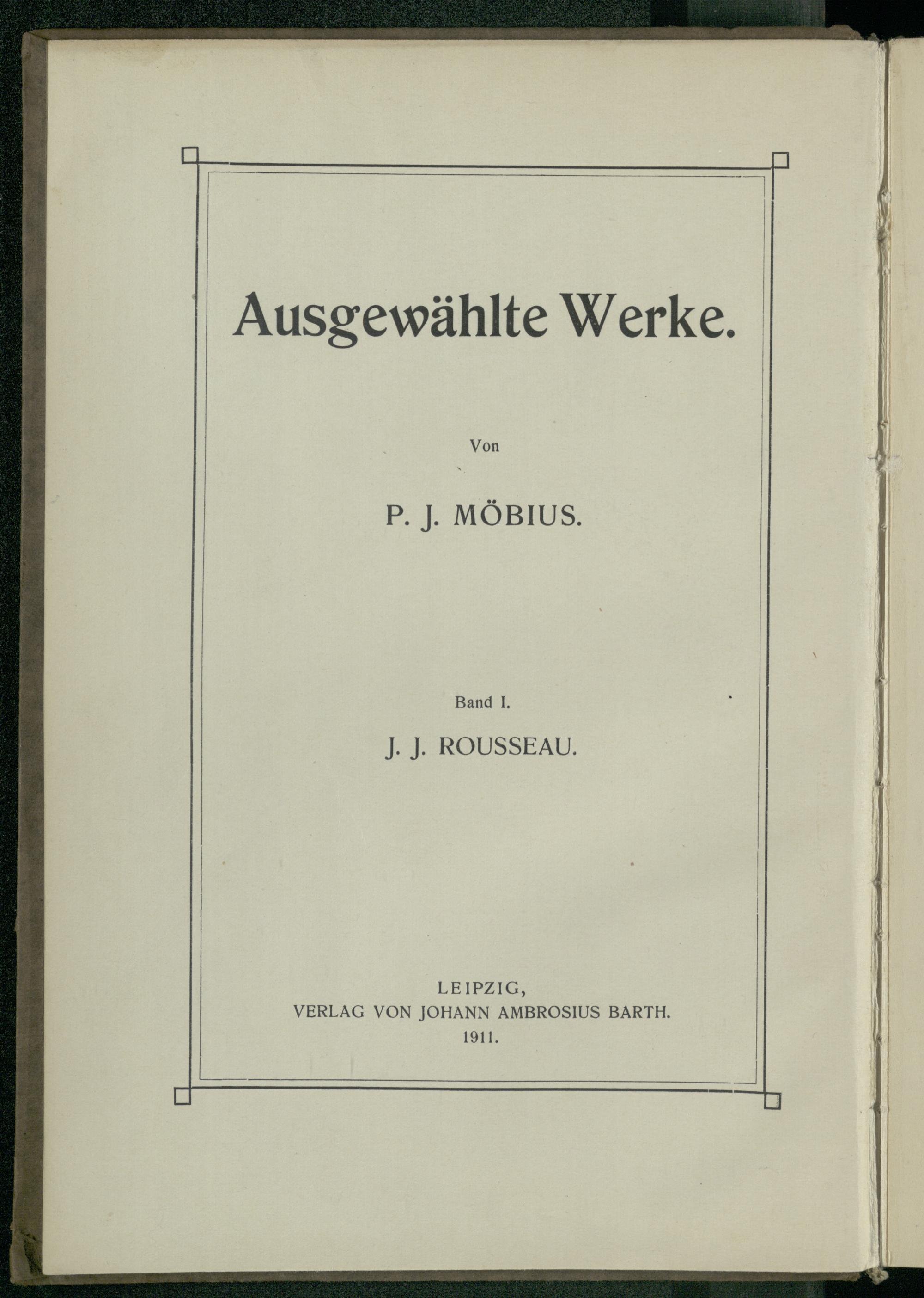 Ausgewählte Werke. Von P. J. MÖBIUS. Band I. J. J. ROUSSEAU. LEIPZIG, VERLAG VON JOHANN AMBROSIUS BARTH. 1911.