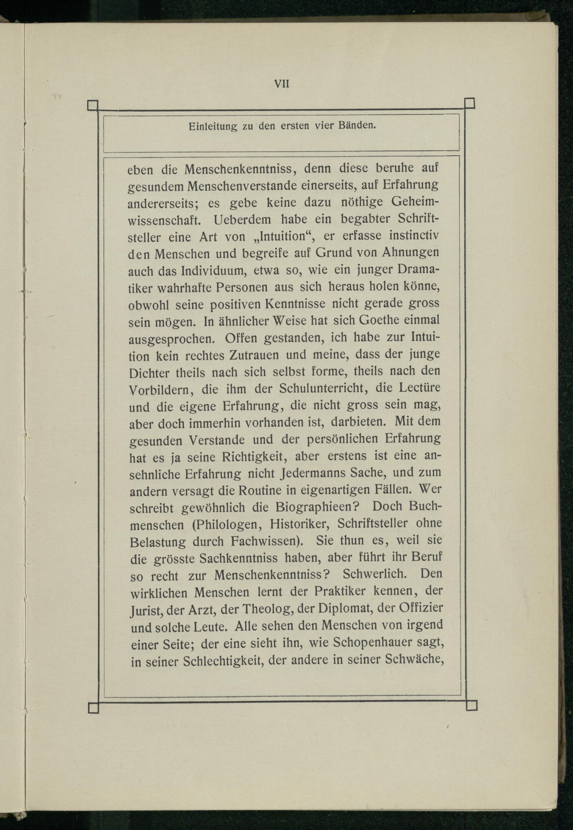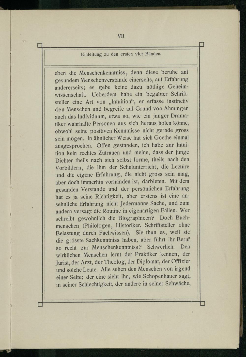 gesundem Menschenverstande einerseits, auf Erfahrung andererseits; es gebe keine dazu nöthige Geheimwissenschaft. Ueberdem habe ein begabter Schriftsteller eine Art von„Intuition“, er erfasse instinctiv den Menschen und begreife auf Grund von Ahnungen auch das Individuum, etwa so, wie ein junger Dramatiker wahrhafte Personen aus sich heraus holen könne, obwohl seine positiven Kenntnisse nicht gerade gross sein mögen. In ähnlicher Weise hat sich Goethe einmal ausgesprochen. Offen gestanden, ich habe zur Intuition kein rechtes Zutrauen und meine, dass der junge Dichter theils nach sich selbst forme, theils nach den Vorbildern, die ihm der Schulunterricht, die Lectüre und die eigene Erfahrung, die nicht gross sein mag, aber doch immerhin vorhanden ist, darbieten. Mit dem gesunden Verstande und der persönlichen Erfahrung hat es ja seine Richtigkeit, aber erstens ist eine ansehnliche Erfahrung nicht Jedermanns Sache, und zum andern versagt die Routine in eigenartigen Fällen. Wer schreibt gewöhnlich die Biographieen? Doch Buchmenschen(Philologen, Historiker, Schriftsteller ohne Belastung durch Fachwissen). Sie thun es, weil sie die grösste Sachkenntniss haben, aber führt ihr Beruf so recht zur Menschenkenntniss? Schwerlich. Den wirklichen Menschen lernt der Praktiker kennen, der Jurist, der Arzt, der Theolog, der Diplomat, der Offizier und solche Leute. Alle sehen den Menschen von irgend einer Seite; der eine sieht ihn, wie Schopenhauer sagt, in seiner Schlechtigkeit, der andere in seiner Schwäche,