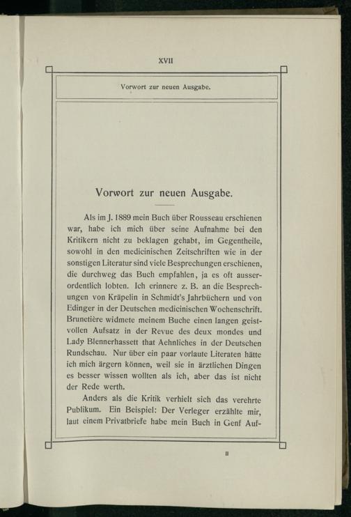 Als im J. 1889 mein Buch über Rousseau erschienen war, habe ich mich über seine Aufnahme bei den Kritikern nicht zu beklagen gehabt, im Gegentheile, sowohl in den medicinischen Zeitschriften wie in der sonstigen Literatur sind viele Besprechungen erschienen, die durchweg das Buch empfahlen, ja es oft ausserordentlich lobten. Ich erinnere z. B. an die Besprechungen von Kräpelin in Schmidt’s Jahrbüchern und von Edinger in der Deutschen medicinischen Wochenschrift. Brunetiere widmete meinem Buche einen langen geistvollen Aufsatz in der Revue des deux mondes und Lady Blennerhassett that Aehnliches in der Deutschen Rundschau. Nur über ein paar vorlaute Literaten hätte ich mich ärgern können, weil sie in ärztlichen Dingen es besser wissen wollten als ich, aber das ist nicht der Rede werth.