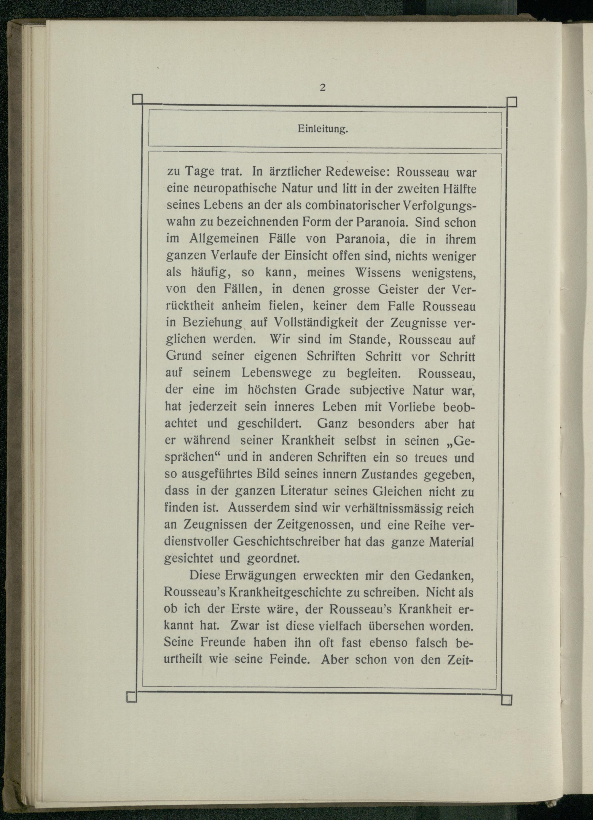 Diese Erwägungen erweckten mir den Gedanken, Rousseau’s Krankheitgeschichte zu schreiben. Nicht als ob ich der Erste wäre, der Rousseau’s Krankheit erkannt hat. Zwar ist diese vielfach übersehen worden. Seine Freunde haben ihn oft fast ebenso falsch beurtheilt wie seine Feinde. Aber schon von den Zeit