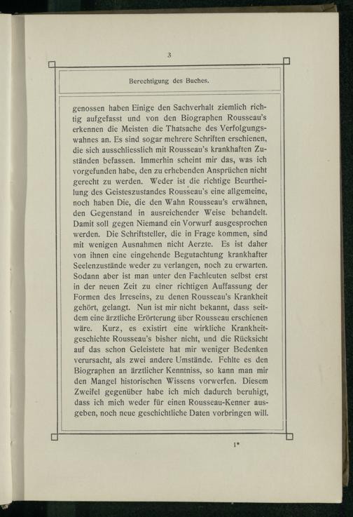 genossen haben Einige den Sachverhalt ziemlich richtig aufgefasst und von den Biographen Rousseau’s erkennen die Meisten die Thatsache des Verfolgungswahnes an. Es sind sogar mehrere Schriften erschienen, die sich ausschliesslich mit Rousseau’s krankhaften Zuständen befassen. Immerhin scheint mir das, was ich vorgefunden habe, den zu erhebenden Ansprüchen nicht gerecht zu werden. Weder ist die richtige Beurtheilung des Geisteszustandes Rousseau’s eine allgemeine, noch haben Die, die den Wahn Rousseau’s erwähnen, den Gegenstand in ausreichender Weise behandelt. Damit soll gegen Niemand ein Vorwurf ausgesprochen werden. Die Schriftsteller, die in Frage kommen, sind mit wenigen Ausnahmen nicht Aerzte. Es ist daher von ihnen eine eingehende Begutachtung krankhafter Seelenzustände weder zu verlangen, noch zu erwarten. Sodann aber ist man unter den Fachleuten selbst erst in der neuen Zeit zu einer richtigen Auffassung der Formen des Irreseins, zu denen Rousseau’s Krankheit gehört, gelangt. Nun ist mir nicht bekannt, dass seitdem eine ärztliche Erörterung über Rousseau erschienen wäre. Kurz, es existirt eine wirkliche Krankheitgeschichte Rousseau’s bisher nicht, und die Rücksicht auf das schon Geleistete hat mir weniger Bedenken verursacht, als zwei andere Umstände. Fehlte es den Biographen an ärztlicher Kenntniss, so kann man mir den Mangel historischen Wissens vorwerfen. Diesem Zweifel gegenüber habe ich mich dadurch beruhigt, dass ich mich weder für einen Rousseau-Kenner ausgeben, noch neue geschichtliche Daten vorbringen will.