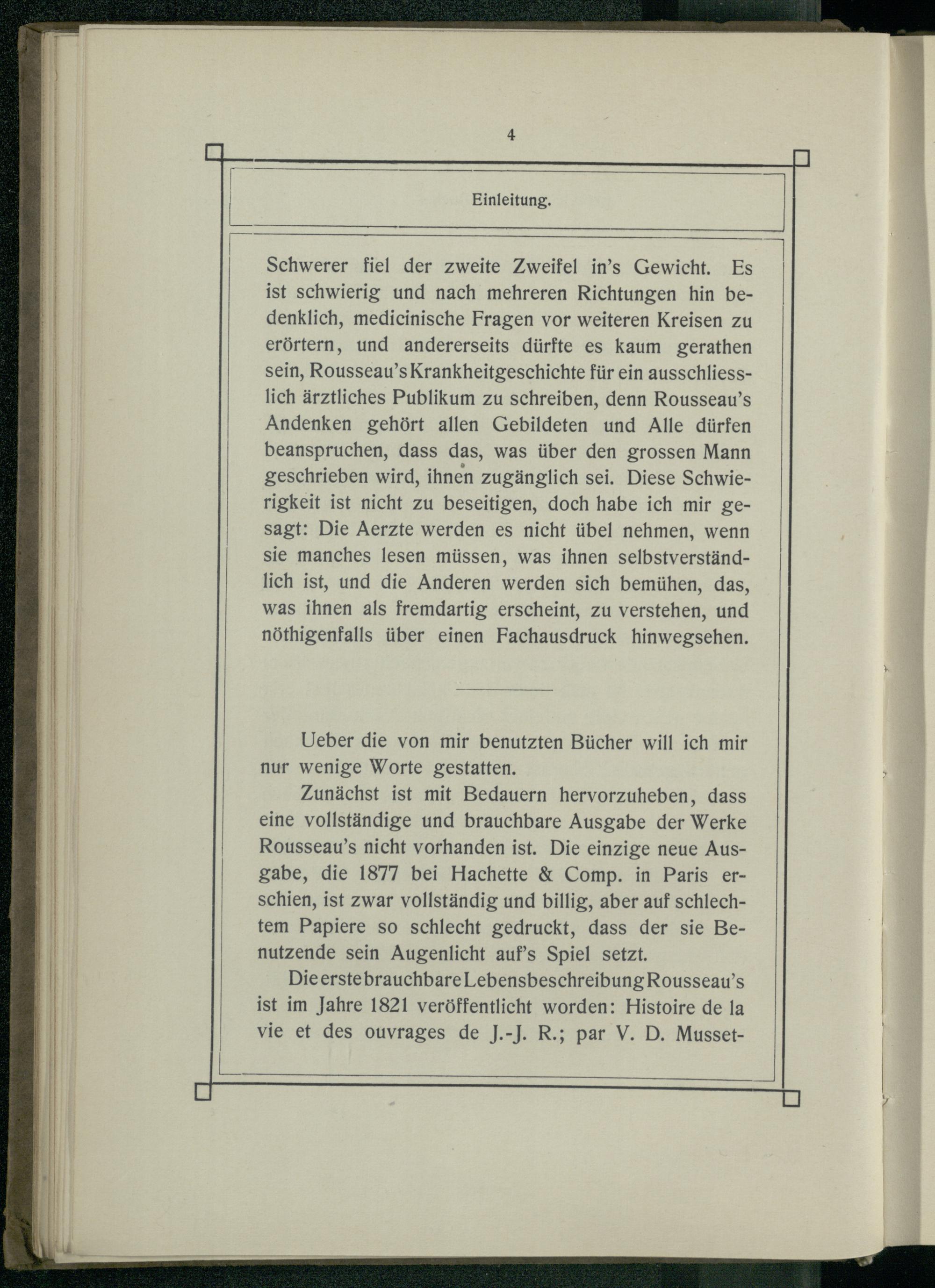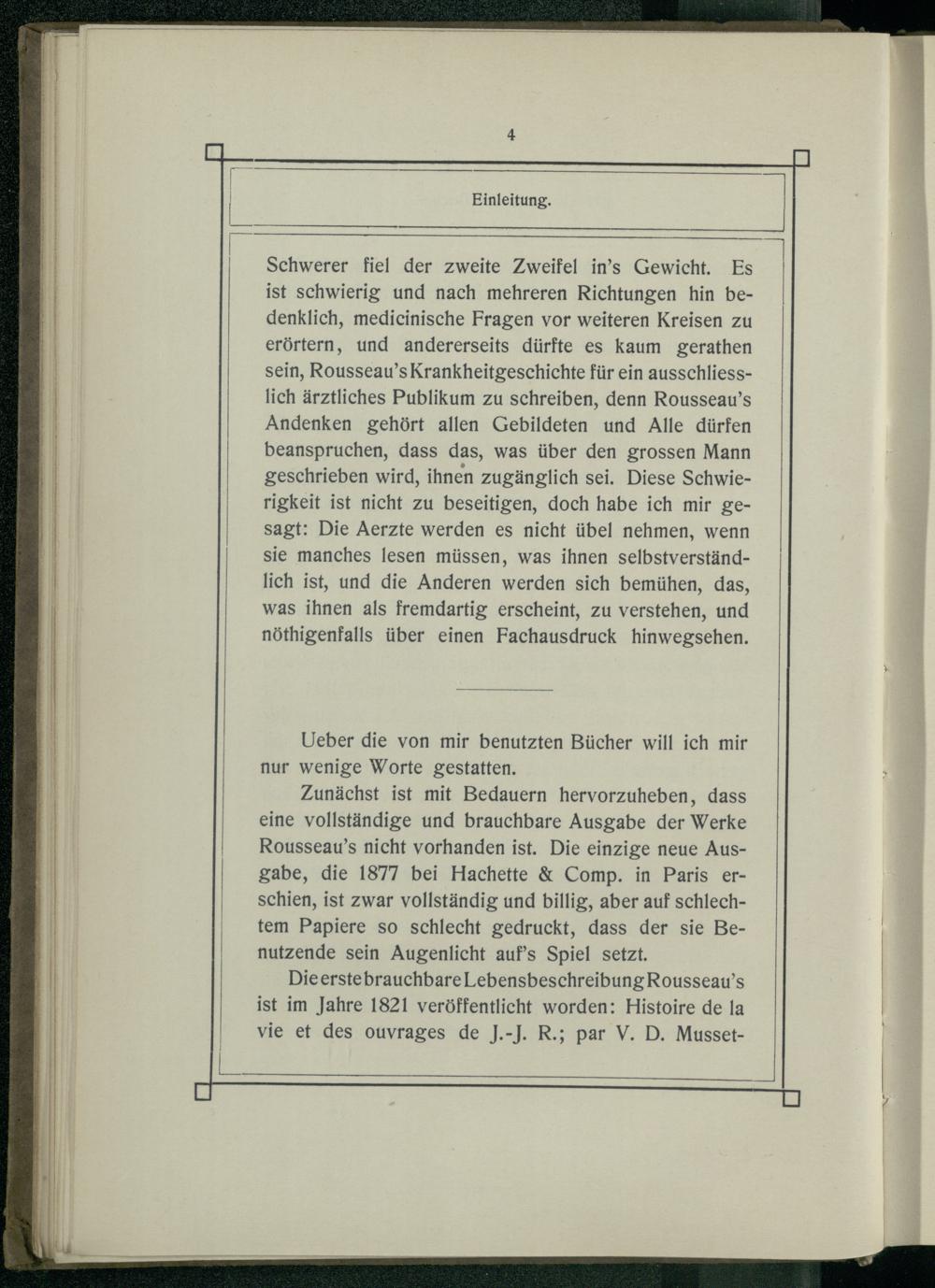 Schwerer fiel der zweite Zweifel in’s Gewicht. Es ist schwierig und nach mehreren Richtungen hin bedenklich, medicinische Fragen vor weiteren Kreisen zu erörtern, und andererseits dürfte es kaum gerathen sein, Rousseau’s Krankheitgeschichte für ein ausschliesslich ärztliches Publikum zu schreiben, denn Rousseau’s Andenken gehört allen Gebildeten und Alle dürfen beanspruchen, dass das, was über den grossen Mann geschrieben wird, ihnen zugänglich sei. Diese Schwierigkeit ist nicht zu beseitigen, doch habe ich mir gesagt: Die Aerzte werden es nicht übel nehmen, wenn sie manches lesen müssen, was ihnen selbstverständlich ist, und die Anderen werden sich bemühen, das, was ihnen als fremdartig erscheint, zu verstehen, und nöthigenfalls über einen Fachausdruck hinwegsehen.