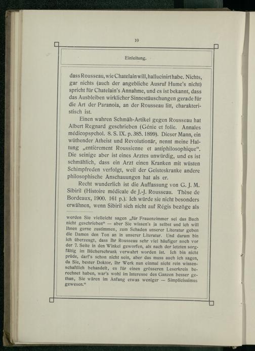 Recht wunderlich ist die Auffassung von G. J. M. Sibiril(Histoire medicale de J.-J. Rousseau. These de Bordeaux, 1900. 161 p.). Ich würde sie nicht besonders erwähnen, wenn Sibiril sich nicht auf Regis bezöge als