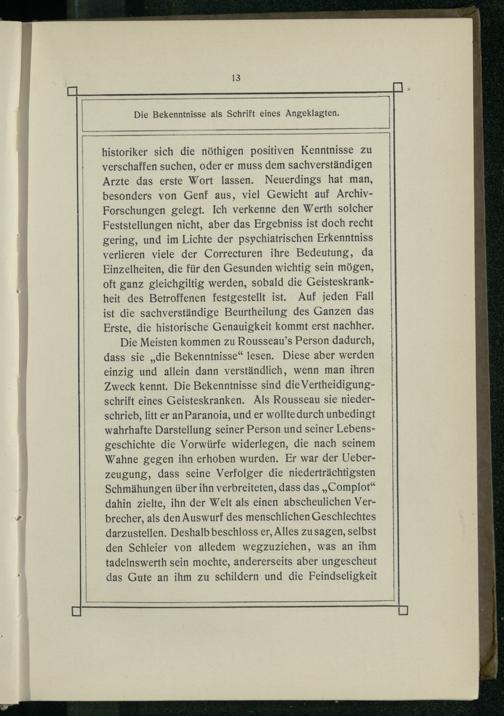Die Meisten kommen zu Rousseau’s Person dadurch, dass sie„die Bekenntnisse“ lesen. Diese aber werden einzig und allein dann verständlich, wenn man ihren Zweck kennt. Die Bekenntnisse sind die Vertheidigungschrift eines Geisteskranken. Als Rousseau sie niederschrieb, litt er anParanoia, und er wollte durch unbedingt wahrhafte Darstellung seiner Person und seiner Lebensgeschichte die Vorwürfe widerlegen, die nach seinem Wahne gegen ihn erhoben wurden. Er war der Ueberzeugung, dass seine Verfolger die niederträchtigsten Schmähungen über ihn verbreiteten, dass das„Complot“ dahin zielte, ihn der Welt als einen abscheulichen Verbrecher, als den Auswurf des menschlichen Geschlechtes darzustellen. Deshalb beschloss er, Alles zusagen, selbst den Schleier von alledem wegzuziehen, was an ihm tadelnswerth sein mochte, andererseits aber ungescheut das Gute an ihm zu schildern und die Feindseligkeit