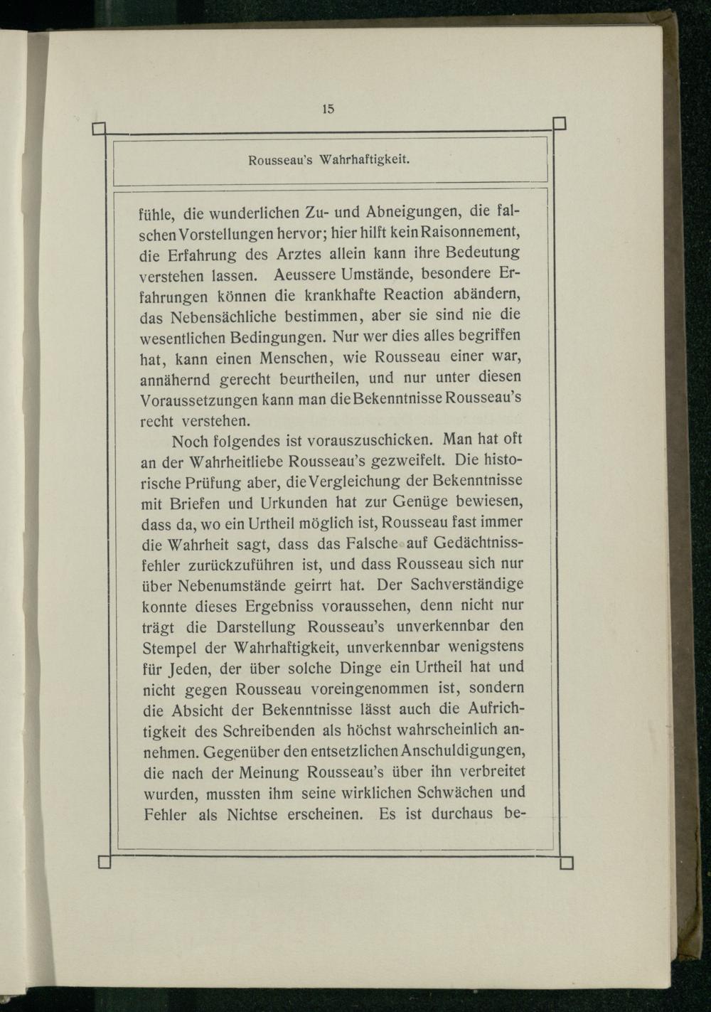 Noch folgendes ist vorauszuschicken. Man hat oft an der Wahrheitliebe Rousseau’s gezweifelt. Die historische Prüfung aber, die Vergleichung der Bekenntnisse mit Briefen und Urkunden hat zur Genüge bewiesen, dass da, wo ein Urtheil möglich ist, Rousseau fast immer die Wahrheit sagt, dass das Falsche-auf Gedächtnissfehler zurückzuführen ist, und dass Rousseau sich nur über Nebenumstände geirrt hat. Der Sachverständige konnte dieses Ergebniss voraussehen, denn nicht nur trägt die Darstellung Rousseau’s unverkennbar den Stempel der Wahrhaftigkeit, unverkennbar wenigstens für Jeden, der über solche Dinge ein Urtheil hat und nicht gegen Rousseau voreingenommen ist, sondern die Absicht der Bekenntnisse lässt auch die Aufrichtigkeit des Schreibenden als höchst wahrscheinlich annehmen. Gegenüber den entsetzlichen Anschuldigungen, die nach der Meinung Rousseau’s über ihn verbreitet wurden, mussten ihm seine wirklichen Schwächen und Fehler als Nichtse erscheinen. Es ist durchaus be