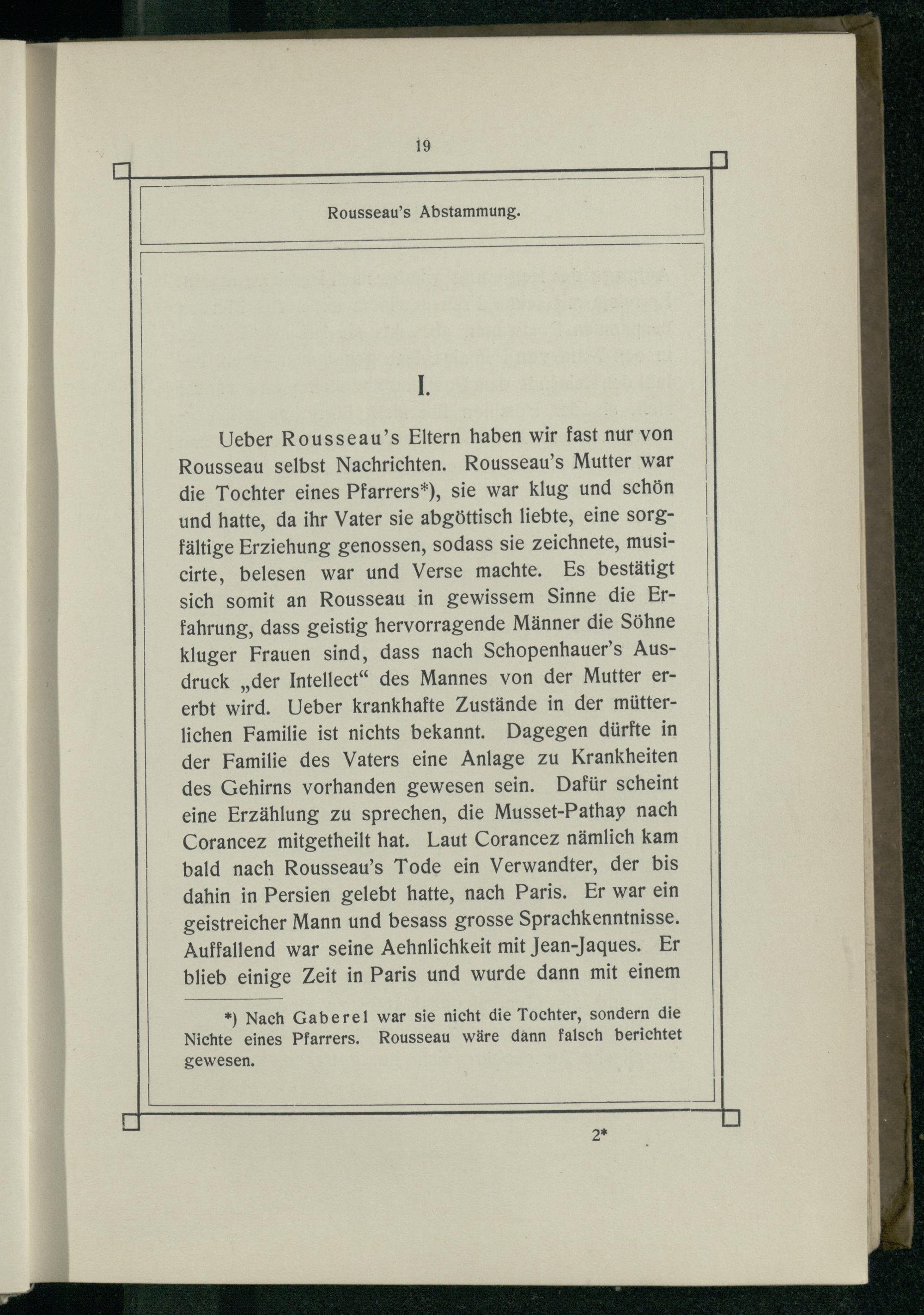 Ueber Rousseau’s Eltern haben wir fast nur von Rousseau selbst Nachrichten. Rousseau’s Mutter war die Tochter eines Pfarrers*), sie war klug und schön und hatte, da ihr Vater sie abgöttisch liebte, eine sorgfältige Erziehung genossen, sodass sie zeichnete, musicirte, belesen war und Verse machte. Es bestätigt sich somit an Rousseau in gewissem Sinne die Erfahrung, dass geistig hervorragende Männer die Söhne kluger Frauen sind, dass nach Schopenhauer’s Ausdruck„der Intellect“ des Mannes von der Mutter ererbt wird. Ueber krankhafte Zustände in der mütterlichen Familie ist nichts bekannt. Dagegen dürfte in der Familie des Vaters eine Anlage zu Krankheiten des Gehirns vorhanden gewesen sein. Dafür scheint eine Erzählung zu sprechen, die Musset-Pathay nach Corancez mitgetheilt hat. Laut Corancez nämlich kam bald nach Rousseau’s Tode ein Verwandter, der bis dahin in Persien gelebt hatte, nach Paris. Er war ein geistreicher Mann und besass grosse Sprachkenntnisse. Auffallend war seine Aehnlichkeit mit Jean-Jaques. Er blieb einige Zeit in Paris und wurde dann mit einem