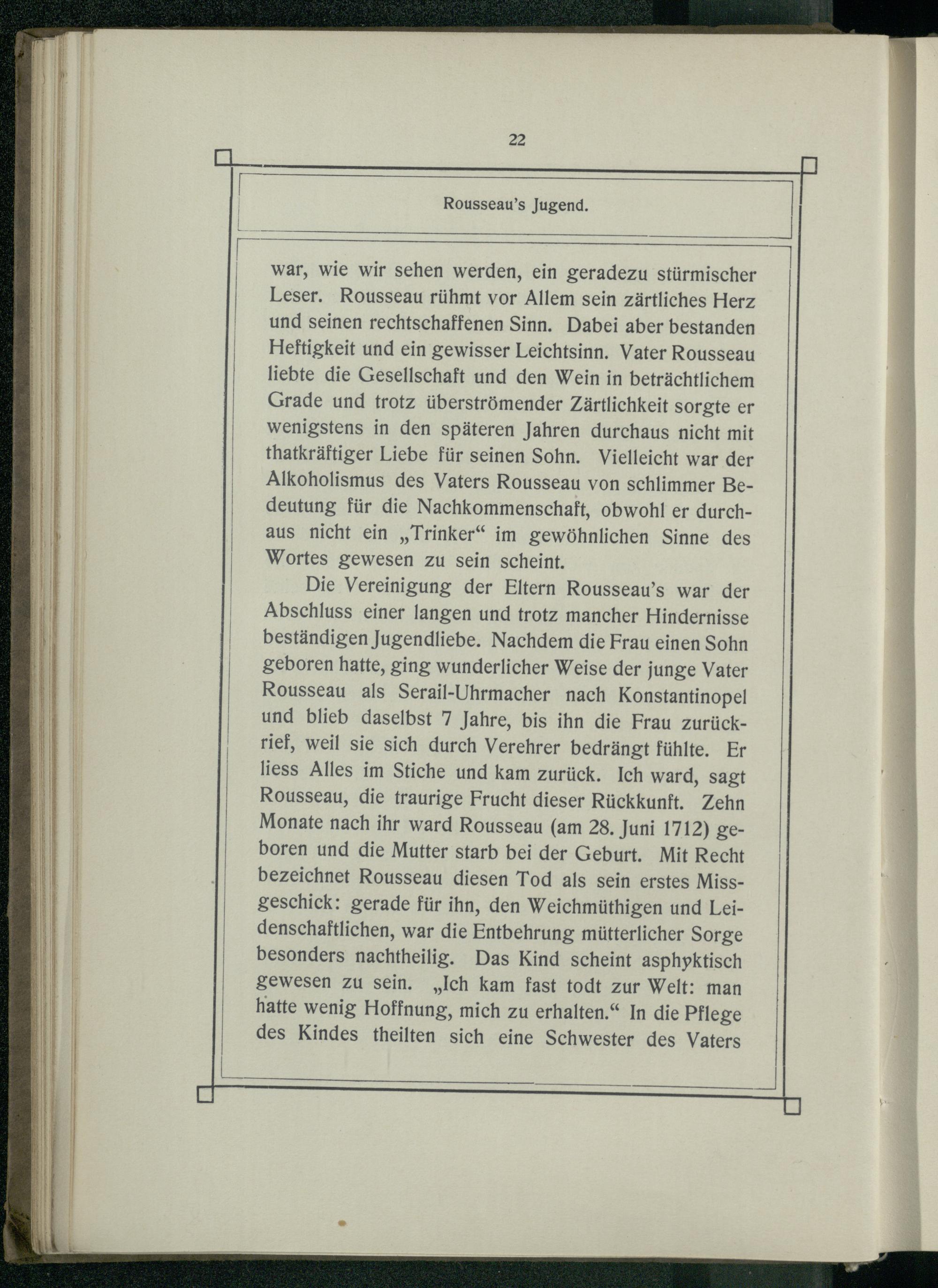 war, wie wir sehen werden, ein geradezu stürmischer Leser. Rousseau rühmt vor Allem sein zärtliches Herz und seinen rechtschaffenen Sinn. Dabei aber bestanden Heftigkeit und ein gewisser Leichtsinn. Vater Rousseau liebte die Gesellschaft und den Wein in beträchtlichem Grade und trotz überströmender Zärtlichkeit sorgte er wenigstens in den späteren Jahren durchaus nicht mit thatkräftiger Liebe für seinen Sohn. Vielleicht war der Alkoholismus des Vaters Rousseau von schlimmer Bedeutung für die Nachkommenschaft, obwohl er durchaus nicht ein„Trinker“ im gewöhnlichen Sinne des Wortes gewesen zu sein scheint.