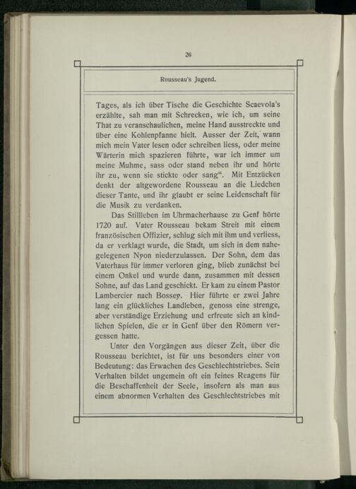 Tages, als ich über Tische die Geschichte Scaevola’s| erzählte, sah man mit Schrecken, wie ich, um seine That zu veranschaulichen, meine Hand ausstreckte und über eine Kohlenpfanne hielt. Ausser der Zeit, wann mich mein Vater lesen oder schreiben liess, oder meine Wärterin mich spazieren führte, war ich immer um meine Muhme, sass oder stand neben ihr und hörte ihr zu, wenn sie stickte oder sang“. Mit Entzücken denkt der altgewordene Rousseau an die Liedchen dieser Tante, und ihr glaubt er seine Leidenschaft für ‚die Musik zu verdanken.