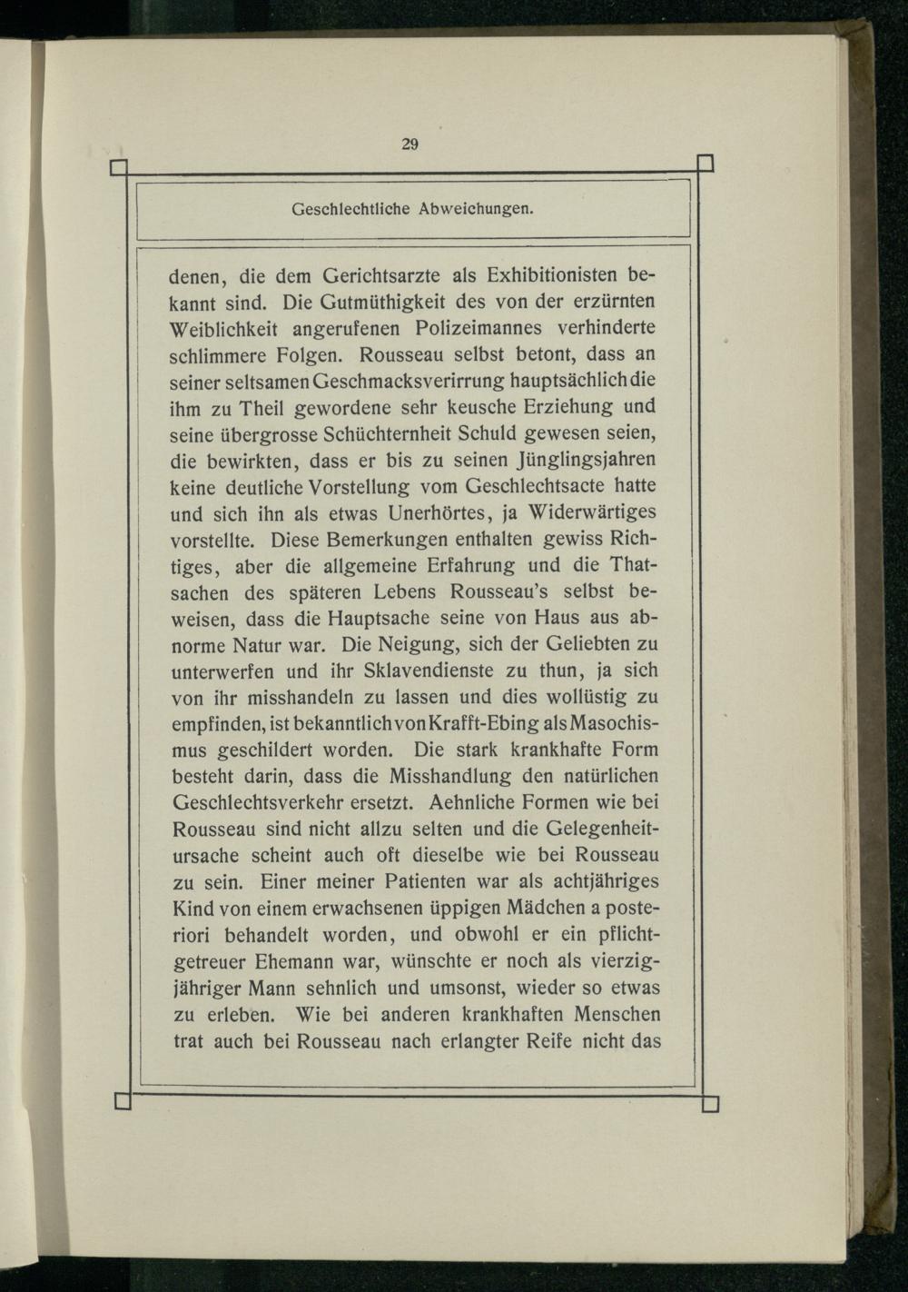 denen, die dem Gerichtsarzte als Exhibitionisten bekannt sind. Die Gutmüthigkeit des von der erzürnten Weiblichkeit angerufenen Polizeimannes verhinderte schlimmere Folgen. Rousseau selbst betont, dass an seiner seltsamen Geschmacksverirrung hauptsächlich die ihm zu Theil gewordene sehr keusche Erziehung und seine übergrosse Schüchternheit Schuld gewesen seien, die bewirkten, dass er bis zu seinen Jünglingsjahren keine deutliche Vorstellung vom Geschlechtsacte hatte und sich ihn als etwas Unerhörtes, ja Widerwärtiges vorstellte. Diese Bemerkungen enthalten gewiss Richtiges, aber die allgemeine Erfahrung und die Thatsachen des späteren Lebens Rousseau’s selbst beweisen, dass die Hauptsache seine von Haus aus abnorme Natur war. Die Neigung, sich der Geliebten zu unterwerfen und ihr Sklavendienste zu thun, ja sich von ihr misshandeln zu lassen und dies wollüstig zu empfinden, ist bekanntlichvon Krafft-Ebing als Masochismus geschildert worden. Die stark krankhafte Form besteht darin, dass die Misshandlung den natürlichen Geschlechtsverkehr ersetzt. Aehnliche Formen wie bei Rousseau sind nicht allzu selten und die Gelegenheitursache scheint auch oft dieselbe wie bei Rousseau zu sein. Einer meiner Patienten war als achtjähriges Kind von einem erwachsenen üppigen Mädchen a posteriori behandelt worden, und obwohl er ein pflichtgetreuer Ehemann war, wünschte er noch als vierzigjähriger Mann sehnlich und umsonst, wieder so etwas zu erleben. Wie bei anderen krankhaften Menschen trat auch bei Rousseau nach erlangter Reife nicht das