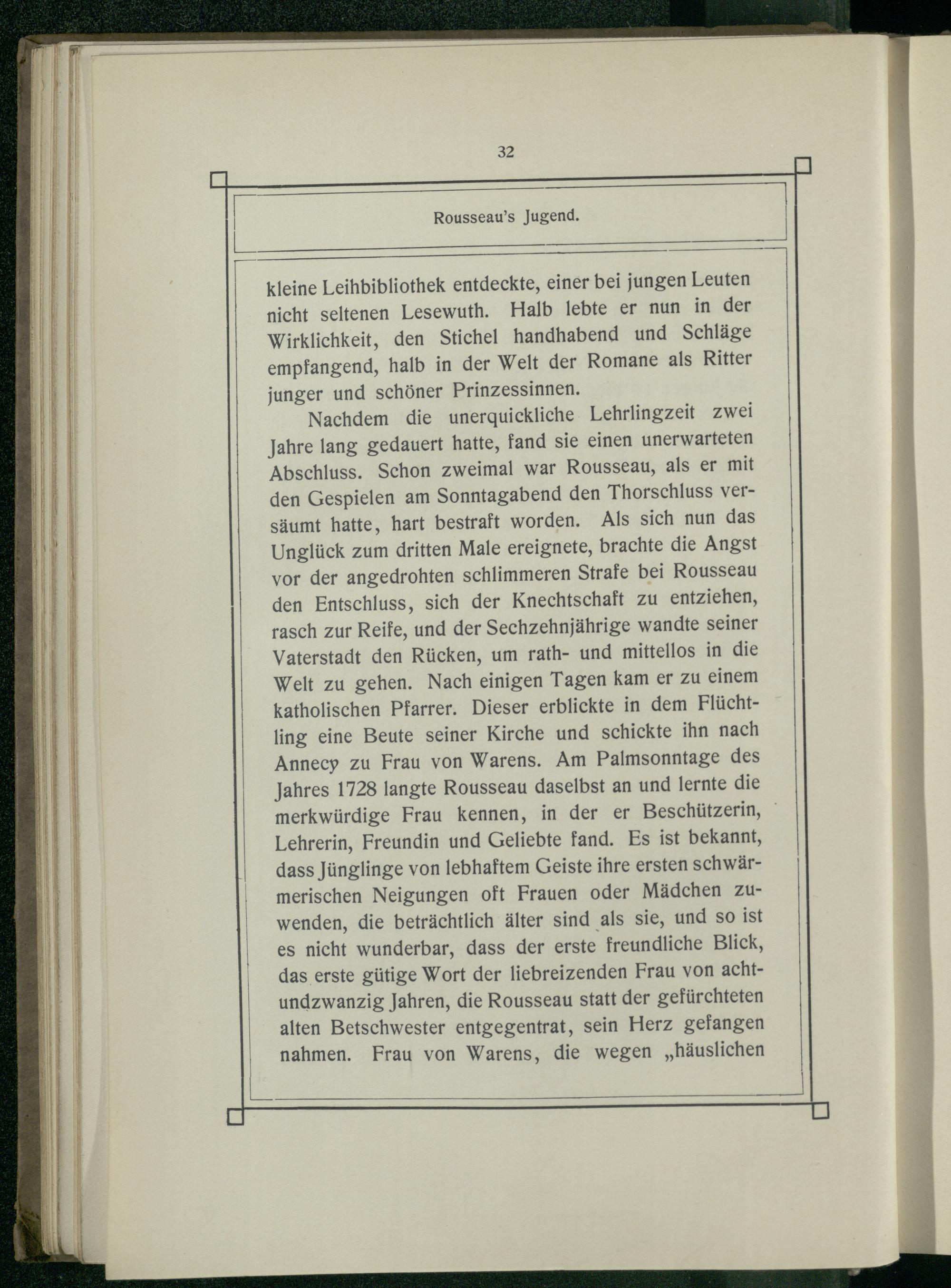 Nachdem die unerquickliche Lehrlingzeit zwei Jahre lang gedauert hatte, fand sie einen unerwarteten Abschluss. Schon zweimal war Rousseau, als er mit den Gespielen am Sonntagabend den Thorschluss versäumt hatte, hart bestraft worden. Als sich nun das Unglück zum dritten Male ereignete, brachte die Angst vor der angedrohten schlimmeren Strafe bei Rousseau den Entschluss, sich der Knechtschaft zu entziehen, rasch zur Reife, und der Sechzehnjährige wandte seiner Vaterstadt den Rücken, um rath- und mittellos in die Welt zu gehen. Nach einigen Tagen kam er zu einem katholischen Pfarrer. Dieser erblickte in dem Flüchtling eine Beute seiner Kirche und schickte ihn nach Annecy zu Frau von Warens. Am Palmsonntage des Jahres 1728 langte Rousseau daselbst an und lernte die merkwürdige Frau kennen, in der er Beschützerin, Lehrerin, Freundin und Geliebte fand. Es ist bekannt, dass Jünglinge von lebhaftem Geiste ihre ersten schwärmerischen Neigungen oft Frauen oder Mädchen zuwenden, die beträchtlich älter sind als sie, und so ist es nicht wunderbar, dass der erste freundliche Blick, das erste gütige Wort der liebreizenden Frau von achtundzwanzig Jahren, die Rousseau statt der gefürchteten alten Betschwester entgegentrat, sein Herz gefangen nahmen. Frau von Warens, die wegen„häuslichen