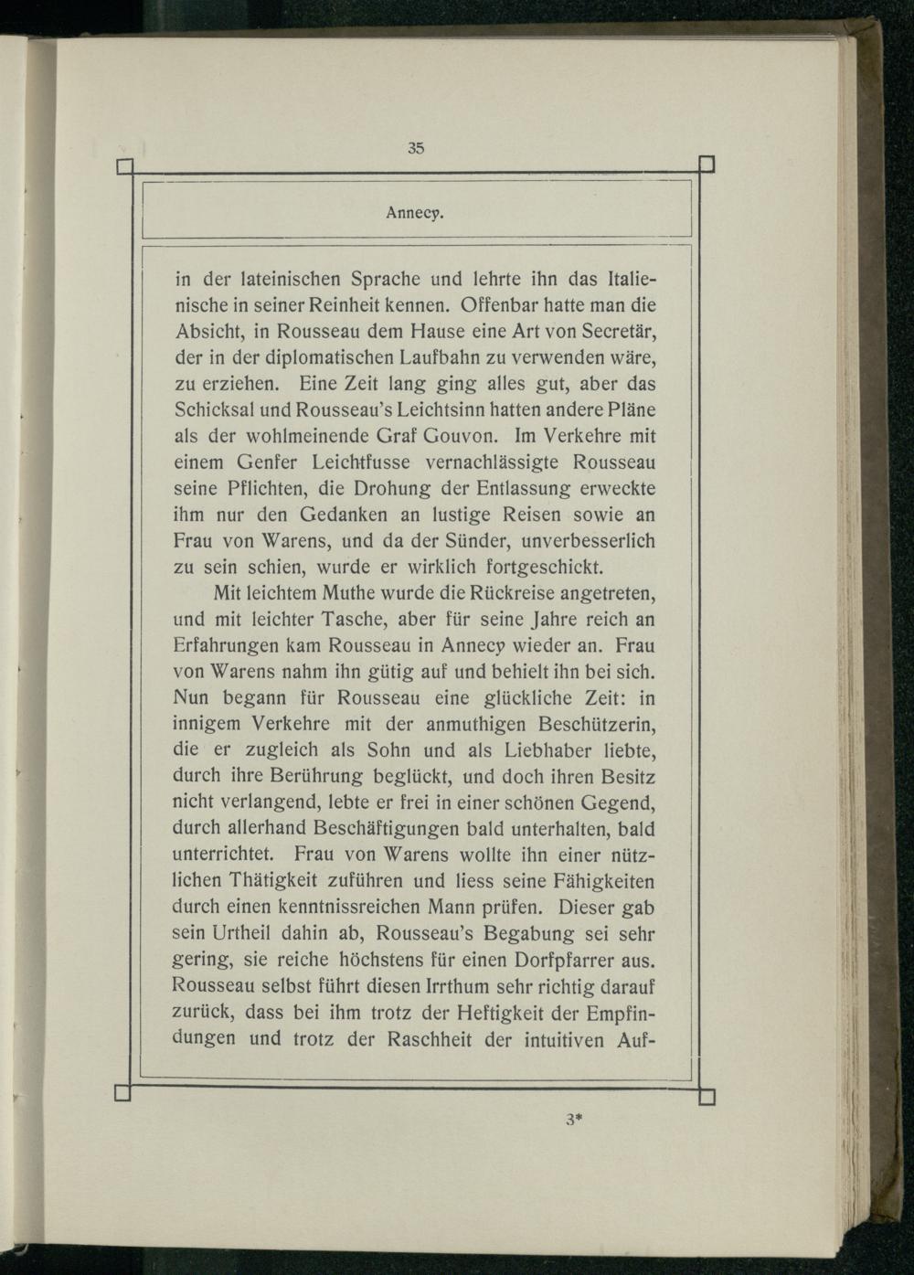 Mit leichtem Muthe wurde die Rückreise angetreten, und mit leichter Tasche, aber für seine Jahre reich an Erfahrungen kam Rousseau in Annecy wieder an. Frau von Warens nahm ihn gütig auf und behielt ihn bei sich. Nun begann für Rousseau eine glückliche Zeit: in innigem Verkehre mit der anmuthigen Beschützerin, die‘ er zugleich als Sohn und als Liebhaber liebte, durch ihre Berührung beglückt, und doch ihren Besitz nicht verlangend, lebte er frei in einer schönen Gegend, durch allerhand Beschäftigungen bald unterhalten, bald unterrichtet. Frau von Warens wollte ihn einer nützlichen Thätigkeit zuführen und liess seine Fähigkeiten durch einen kenntnissreichen Mann prüfen. Dieser gab sein Urtheil dahin ab, Rousseau’s Begabung sei sehr gering, sie reiche höchstens für einen Dorfpfarrer aus. Rousseau selbst führt diesen Irrthum sehr richtig darauf zurück, dass bei ihm trotz der Heftigkeit der Empfindungen und trotz der Raschheit der intuitiven Auf