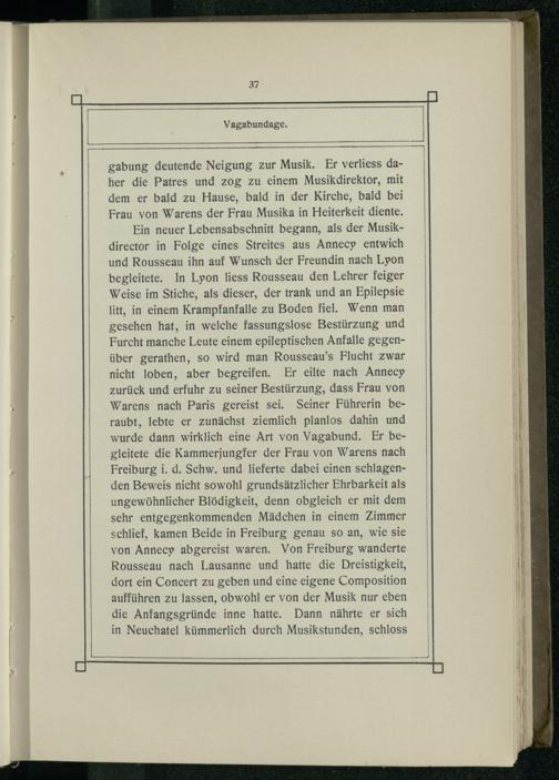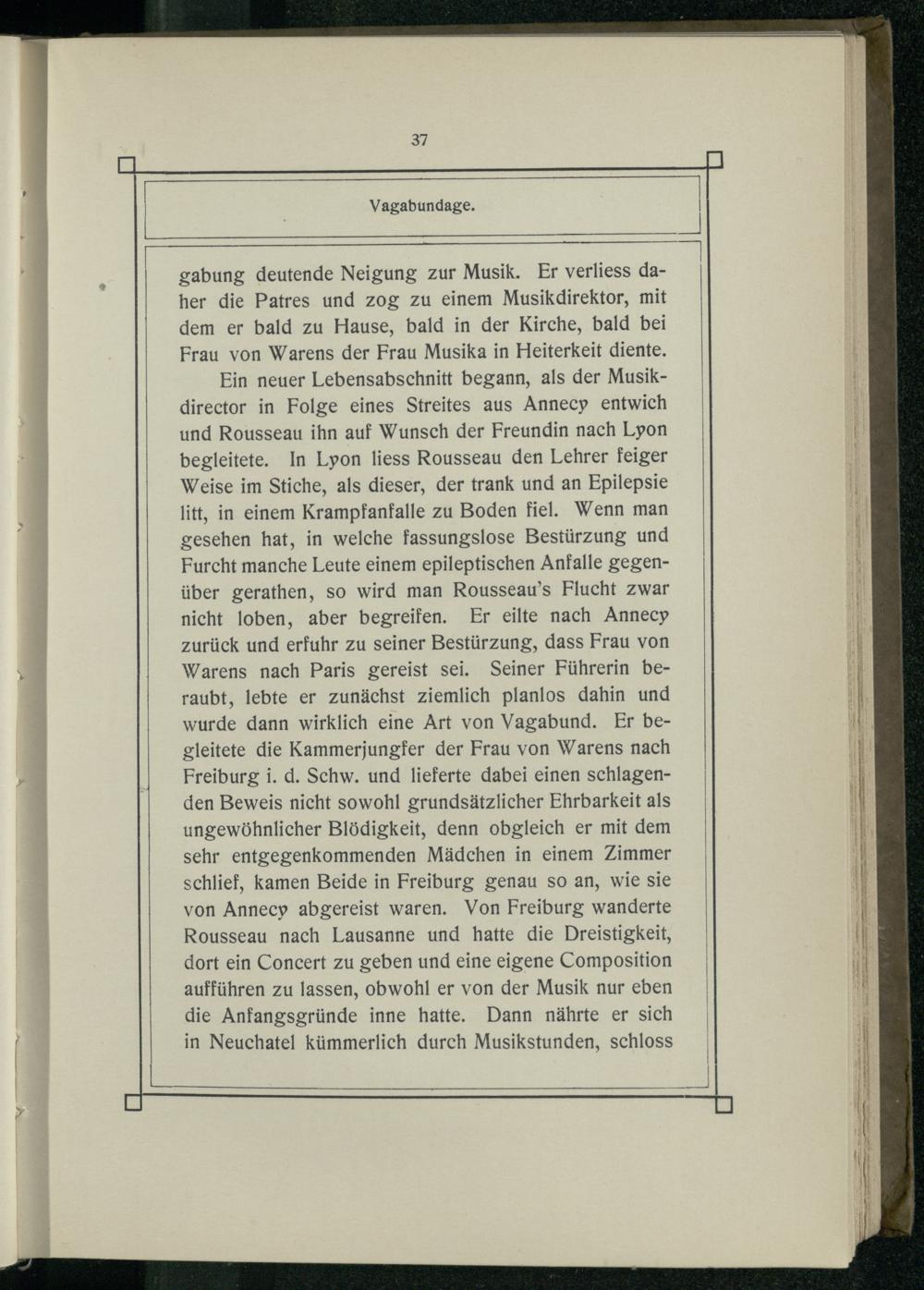 Ein neuer Lebensabschnitt begann, als der Musikdirector in Folge eines Streites aus Annecy entwich und Rousseau ihn auf Wunsch der Freundin nach Lyon begleitete. In Lyon liess Rousseau den Lehrer feiger Weise im Stiche, als dieser, der trank und an Epilepsie litt, in einem Krampfanfalle zu Boden fiel. Wenn man gesehen hat, in welche fassungslose Bestürzung und Furcht manche Leute einem epileptischen Anfalle gegenüber gerathen, so wird man Rousseau’s Flucht zwar nicht loben, aber begreifen. Er eilte nach Annecy zurück und erfuhr zu seiner Bestürzung, dass Frau von Warens nach Paris gereist sei. Seiner Führerin beraubt, lebte er zunächst ziemlich planlos dahin und wurde dann wirklich eine Art von Vagabund. Er begleitete die Kammerjungfer der Frau von Warens nach Freiburg i. d. Schw. und lieferte dabei einen schlagenden Beweis nicht sowohl grundsätzlicher Ehrbarkeit als ungewöhnlicher Blödigkeit, denn obgleich er mit dem sehr entgegenkommenden Mädchen in einem Zimmer schlief, kamen Beide in Freiburg genau so an, wie sie von Annecyp abgereist waren. Von Freiburg wanderte Rousseau nach Lausanne und hatte die Dreistigkeit, dort ein Concert zu geben und eine eigene Composition aufführen zu lassen, obwohl er von der Musik nur eben die Anfangsgründe inne hatte. Dann nährte er sich in Neuchatel kümmerlich durch Musikstunden, schloss