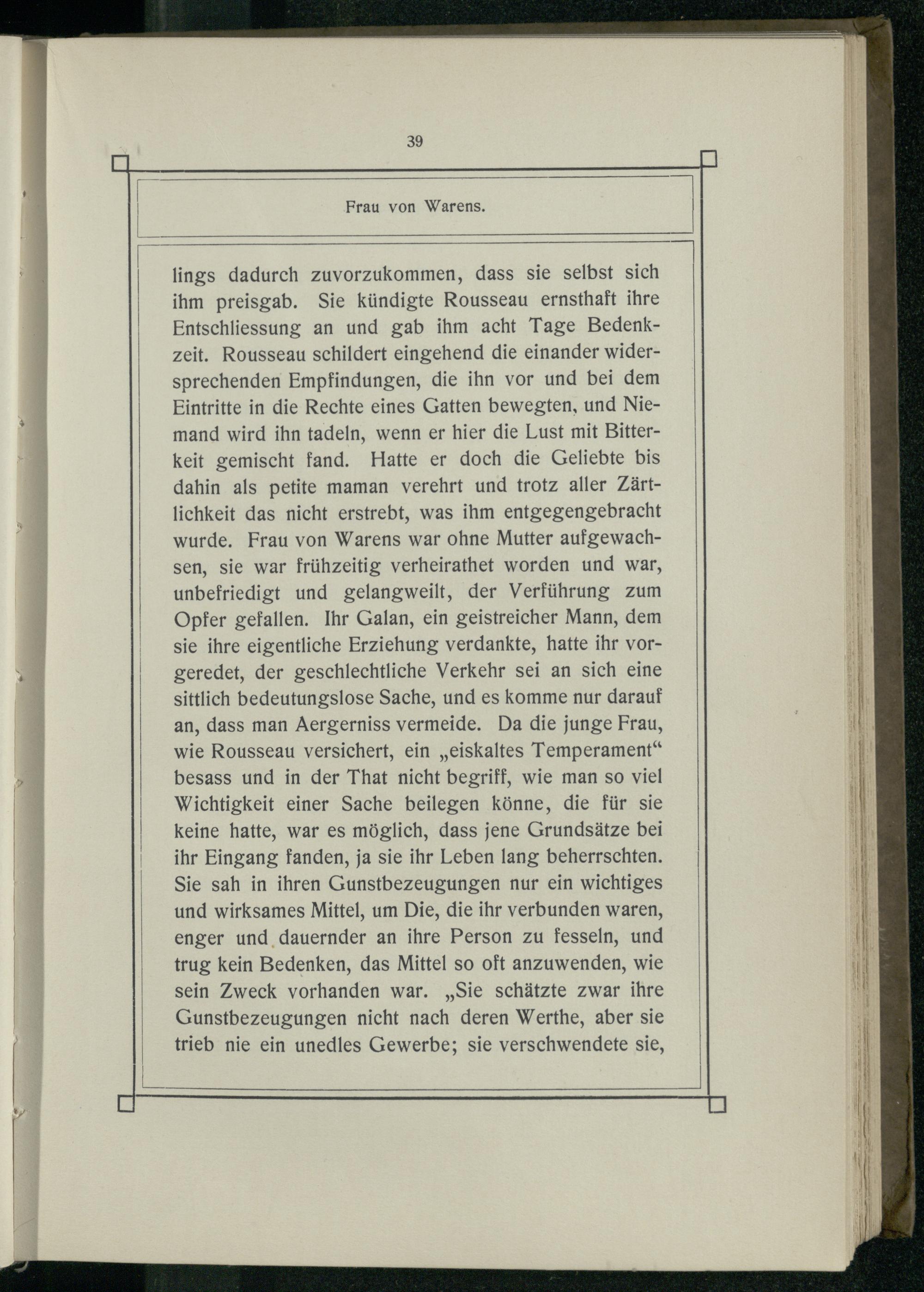 lings dadurch zuvorzukommen, dass sie selbst sich ihm preisgab. Sie kündigte Rousseau ernsthaft ihre Entschliessung an und gab ihm acht Tage Bedenkzeit. Rousseau schildert eingehend die einander widersprechenden Empfindungen, die ihn vor und bei dem Eintritte in die Rechte eines Gatten bewegten, und Niemand wird ihn tadeln, wenn er hier die Lust mit Bitterkeit gemischt fand. Hatte er doch die Geliebte bis dahin als petite maman verehrt und trotz aller Zärtlichkeit das nicht erstrebt, was ihm entgegengebracht wurde. Frau von Warens war ohne Mutter aufgewachsen, sie war frühzeitig verheirathet worden und war, unbefriedigt und gelangweilt, der Verführung zum Opfer gefallen. Ihr Galan, ein geistreicher Mann, dem sie ihre eigentliche Erziehung verdankte, hatte ihr vorgeredet, der geschlechtliche Verkehr sei an sich eine sittlich bedeutungslose Sache, und es komme nur darauf an, dass man Aergerniss vermeide. Da die junge Frau, wie Rousseau versichert, ein„eiskaltes Temperament“ besass und in der That nicht begriff, wie man so viel Wichtigkeit einer Sache beilegen könne, die für sie keine hatte, war es möglich, dass jene Grundsätze bei ihr Eingang fanden, ja sie ihr Leben lang beherrschten. Sie sah in ihren Gunstbezeugungen nur ein wichtiges und wirksames Mittel, um Die, die ihr verbunden waren, enger und dauernder an ihre Person zu fesseln, und trug kein Bedenken, das Mittel so oft anzuwenden, wie sein Zweck vorhanden war.„Sie schätzte zwar ihre Gunstbezeugungen nicht nach deren Werthe, aber sie trieb nie ein unedles Gewerbe; sie verschwendete sie,
