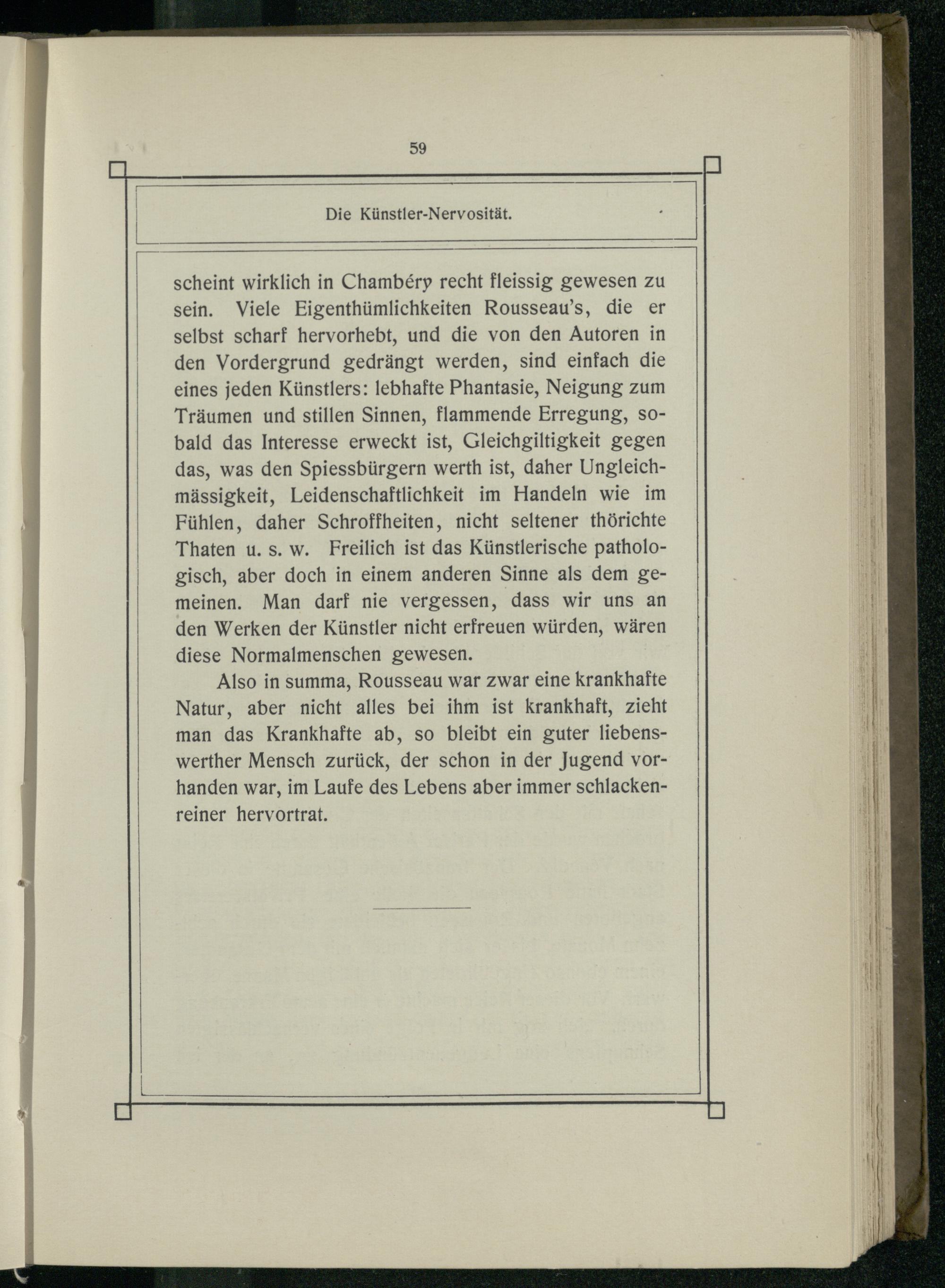 scheint wirklich in Chamberpy recht fleissig gewesen zu sein. Viele Eigenthümlichkeiten Rousseau’s, die er selbst scharf hervorhebt, und die von den Autoren in den Vordergrund gedrängt werden, sind einfach die eines jeden Künstlers: lebhafte Phantasie, Neigung zum Träumen und stillen Sinnen, flammende Erregung, Sobald das Interesse erweckt ist, Gleichgiltigkeit gegen das, was den Spiessbürgern werth ist, daher Ungleichmässigkeit, Leidenschaftlichkeit im Handeln wie im Fühlen, daher Schroffheiten, nicht seltener thörichte Thaten u. s. w. Freilich ist das Künstlerische pathologisch, aber doch in einem anderen Sinne als dem gemeinen. Man darf nie vergessen, dass wir uns an den Werken der Künstler nicht erfreuen würden, wären diese Normalmenschen gewesen.