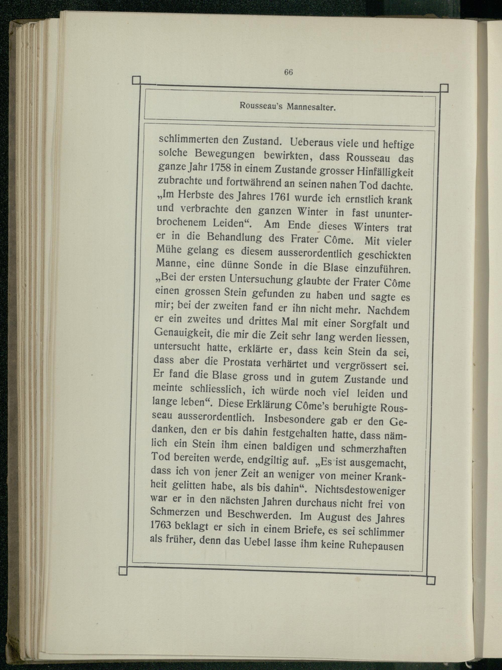 schlimmerten den Zustand. Ueberaus viele und heftige solche Bewegungen bewirkten, dass Rousseau das ganze Jahr 1758 in einem Zustande grosser Hinfälligkeit zubrachte und fortwährend an seinen nahen Tod dachte. „Im Herbste des Jahres 1761 wurde ich ernstlich krank und verbrachte den ganzen Winter in fast ununterbrochenem Leiden“. Am Ende dieses Winters trat er in die Behandlung des Frater Cöme. Mit vieler Mühe gelang es diesem ausserordentlich geschickten Manne, eine dünne Sonde in die Blase einzuführen. „Bei der ersten Untersuchung glaubte der Frater Cöme einen grossen Stein gefunden zu haben und sagte es mir; bei der zweiten fand er ihn nicht mehr. Nachdem er ein zweites und drittes Mal mit einer Sorgfalt und Genauigkeit, die mir die Zeit sehr lang werden liessen, untersucht hatte, erklärte er, dass kein Stein da sei, dass aber die Prostata verhärtet und vergrössert sei. Er fand die Blase gross und in gutem Zustande und meinte schliesslich, ich würde noch viel leiden und lange leben“, Diese Erklärung Cöme’s beruhigte RousSeau ausserordentlich. Insbesondere gab er den Gedanken, den er bis dahin festgehalten hatte, dass nämlich ein Stein ihm einen baldigen und schmerzhaften Tod bereiten werde, endgiltig auf.„Es’ist ausgemacht, dass ich von jener Zeit an weniger von meiner Krankheit gelitten habe, als bis dahin“. Nichtsdestoweniger war er in den nächsten Jahren durchaus nicht frei von Schmerzen und Beschwerden. Im August des Jahres 1763 beklagt er sich in einem Briefe, es sei schlimmer als früher, denn das Uebel lasse ihm keine Ruhepausen