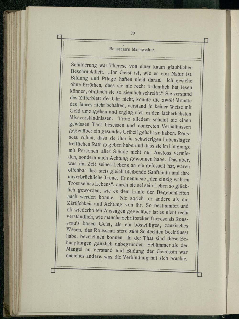 Schilderung war Therese von einer kaum glaublichen Beschränktheit.„Ihr Geist ist, wie er von Natur ist. Bildung und Pflege haften nicht daran. Ich gestehe ohne Erröthen, dass sie nie recht ordentlich hat lesen können, obgleich sie so ziemlich schreibt.“ Sie verstand das Zifferblatt der Uhr nicht, konnte die zwölf Monate des Jahres nicht behalten, verstand in keiner Weise mit Geld umzugehen und erging sich in den lächerlichsten Missverständnissen. Trotz alledem scheint sie einen gewissen Tact besessen und concreten Verhältnissen gegenüber ein gesundes Urtheil gehabt zu haben. Rousseau rühmt, dass sie ihm in schwierigen Lebenslagen trefflichen Rath gegeben habe,und dass sie im Umgange mit Personen aller Stände nicht nur Anstoss vermieden, sondern auch Achtung gewonnen habe. Das aber, was ihn Zeit seines Lebens an sie gefesselt hat, waren offenbar ihre stets gleich bleibende Sanftmuth und ihre unverbrüchliche Treue. Er nennt sie„den einzig wahren Trost seines Lebens“, durch sie sei sein Leben so glücklich geworden, wie es dem Laufe der Begebenheiten nach werden konnte. Nie spricht er anders als mit Zärtlichkeit und Achtung von ihr. So bestimmten und oft wiederholten Aussagen gegenüber ist es nicht recht verständlich, wie manche Schriftsteller Therese als Rousseau’s bösen Geist, als ein böswilliges, zänkisches Wesen, das Rousseau stets zum Schlechten beeinflusst habe, bezeichnen können. In der That sind diese Behauptungen gänzlich unbegründet. Schlimmer als der Mangel an Verstand und Bildung der Genossin war manches andere, was die Verbindung mit sich brachte.