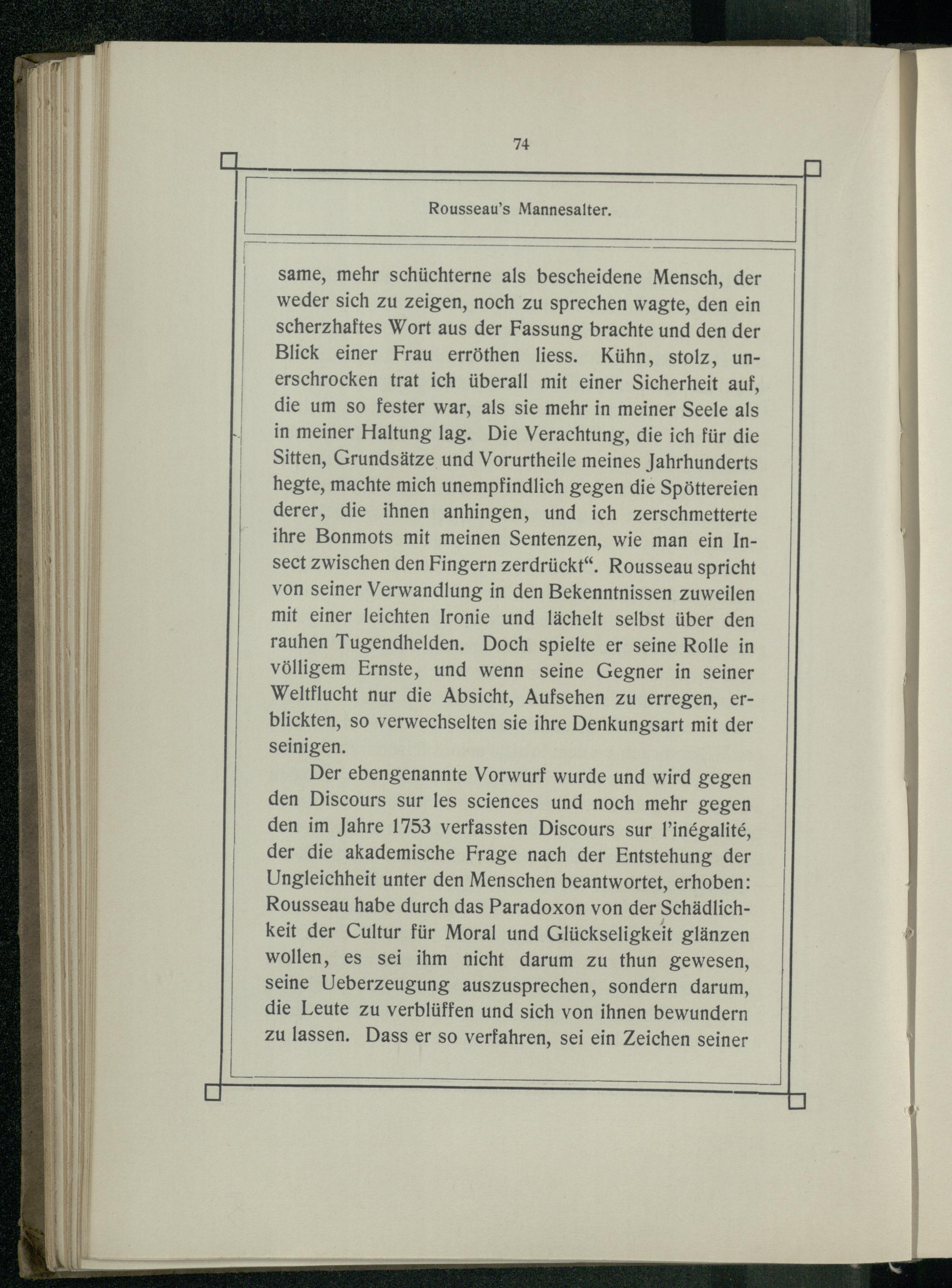 Der ebengenannte Vorwurf wurde und wird gegen den Discours sur les sciences und noch mehr gegen den im Jahre 1753 verfassten Discours sur l’inegalite, der die akademische Frage nach der Entstehung der Ungleichheit unter den Menschen beantwortet, erhoben: Rousseau habe durch das Paradoxon von der Schädlichkeit der Cultur für Moral und Glückseligkeit glänzen wollen, es sei ihm nicht darum zu thun gewesen, seine Ueberzeugung auszusprechen, sondern darum, die Leute zu verblüffen und sich von ihnen bewundern zu lassen. Dass er so verfahren, sei ein Zeichen seiner