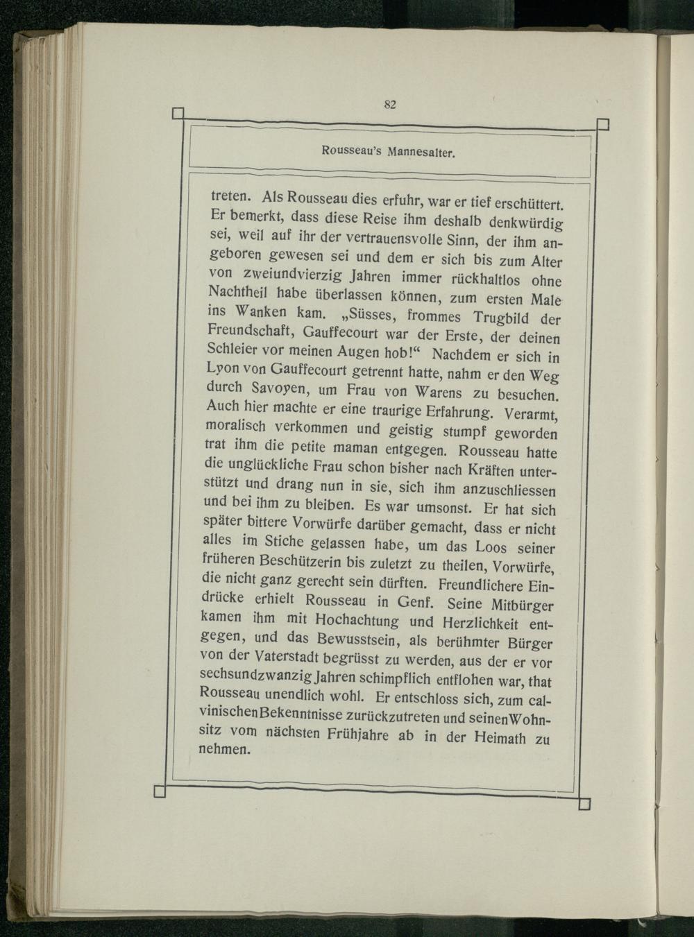 treten. Als Rousseau dies erfuhr, war er tief erschüttert. Er bemerkt, dass diese Reise ihm deshalb denkwürdig sei, weil auf ihr der vertrauensvolle Sinn, der ihm angeboren gewesen sei und dem er sich bis zum Alter von Zweiundvierzig Jahren immer rückhaltlos ohne | Nachtheil habe überlassen können, zum ersten Male ins Wanken kam.„Süsses, frommes Trugbild der Freundschaft, Gauffecourt war der Erste, der deinen Schleier vor meinen Augen hob!“ Nachdem er sich in Lyon von Gauffecourt getrennt hatte, nahm er den Weg durch Savoyen, um Frau von Warens zu besuchen. Auch hier machte er eine traurige Erfahrung, Verarmt, moralisch verkommen und geistig stumpf geworden trat ihm die petite maman entgegen. Rousseau hatte die unglückliche Frau schon bisher nach Kräften unterstützt und drang nun in sie, sich ihm anzuschliessen und bei ihm zu bleiben. Es war umsonst. Er hat sich später bittere Vorwürfe darüber gemacht, dass er nicht alles im Stiche gelassen habe, um das Loos seiner früheren Beschützerin bis zuletzt zu theilen, Vorwürfe, die nicht ganz gerecht sein dürften. Freundlichere Eindrücke erhielt Rousseau in Genf. Seine Mitbürger kamen ihm mit Hochachtung und Herzlichkeit entgegen, und das Bewusstsein, als berühmter Bürger von der Vaterstadt begrüsst zu werden, aus der er vor sechsundzwanzig Jahren schimpflich entflohen war, that Rousseau unendlich wohl. Er entschloss sich, zum calVinischenBekenntnisse zurückzutreten und seinenWohnsitz vom nächsten Frühjahre ab in der Heimath zu nehmen.