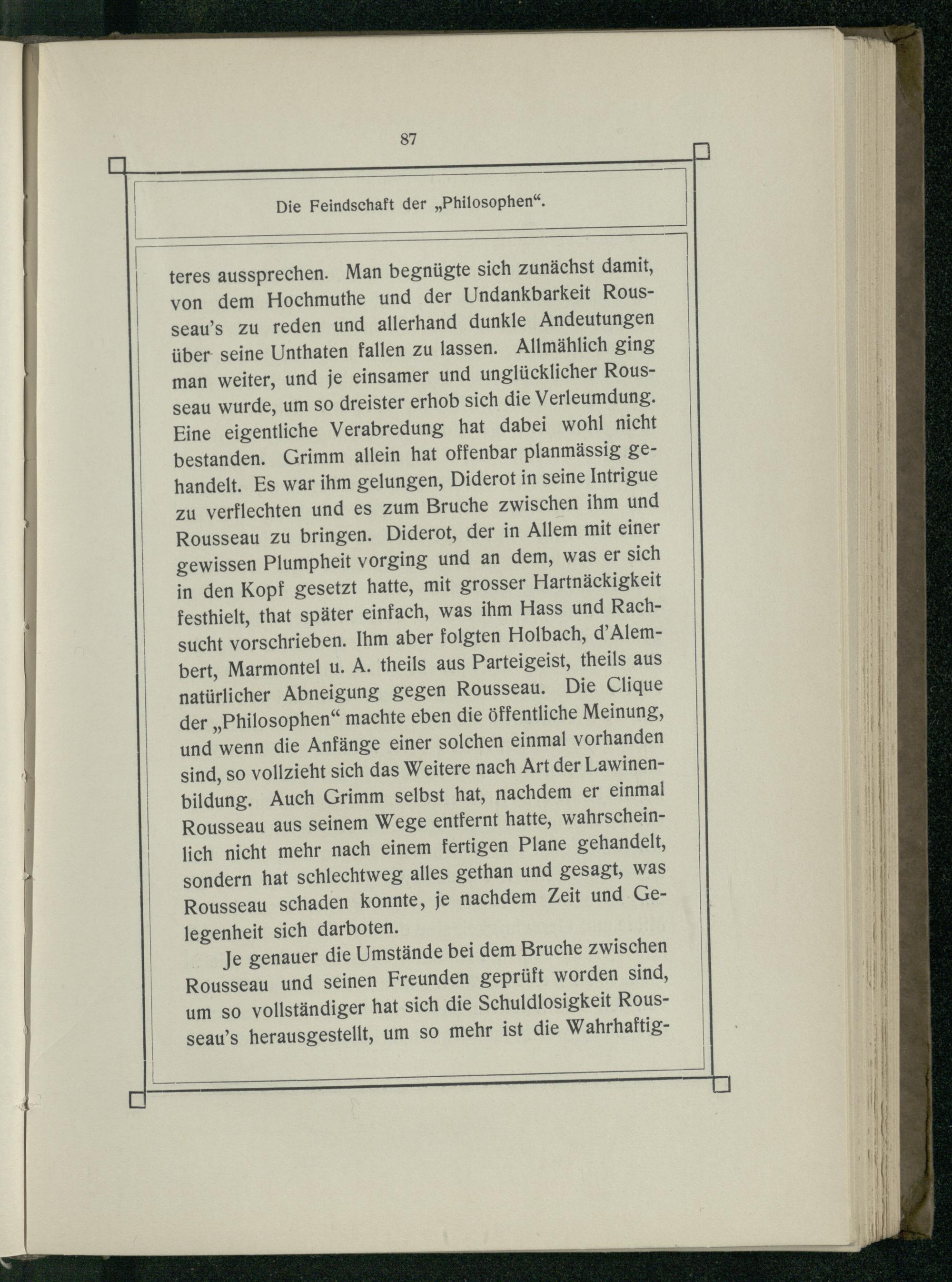 teres aussprechen. Man begnügte sich zunächst damit, von dem Hochmuthe und der Undankbarkeit Rousseau’s zu reden und allerhand dunkle Andeutungen über- seine Unthaten fallen zu lassen. Allmählich ging man weiter, und je einsamer und unglücklicher Rousseau wurde, um so dreister erhob sich die Verleumdung. Eine eigentliche Verabredung hat dabei wohl nicht bestanden. Grimm allein hat offenbar planmässig gehandelt. Es war ihm gelungen, Diderot in seine Intrigue zu verflechten und es zum Bruche zwischen ihm und Rousseau zu bringen. Diderot, der in Allem mit einer gewissen Plumpheit vorging und an dem, was er sich in den Kopf gesetzt hatte, mit grosser Hartnäckigkeit festhielt, that später einfach, was ihm Hass und Rachsucht vorschrieben. Ihm aber folgten Holbach, d’Alembert, Marmontel u. A. theils aus Parteigeist, theils aus natürlicher Abneigung gegen Rousseau. Die Clique der„Philosophen“ machte eben die öffentliche Meinung, und wenn die Anfänge einer solchen einmal vorhanden sind, so vollzieht sich das Weitere nach Art der Lawinenbildung. Auch Grimm selbst hat, nachdem er einmal Rousseau aus seinem Wege entfernt hatte, wahrscheinlich nicht mehr nach einem fertigen Plane gehandelt, sondern hat schlechtweg alles gethan und gesagt, Was Rousseau schaden konnte, je nachdem Zeit und Gelegenheit sich darboten. Je genauer die Umstände bei dem Bruche zwischen Rousseau und seinen Freunden geprüft worden sind, um so vollständiger hat sich die Schuldlosigkeit Rous