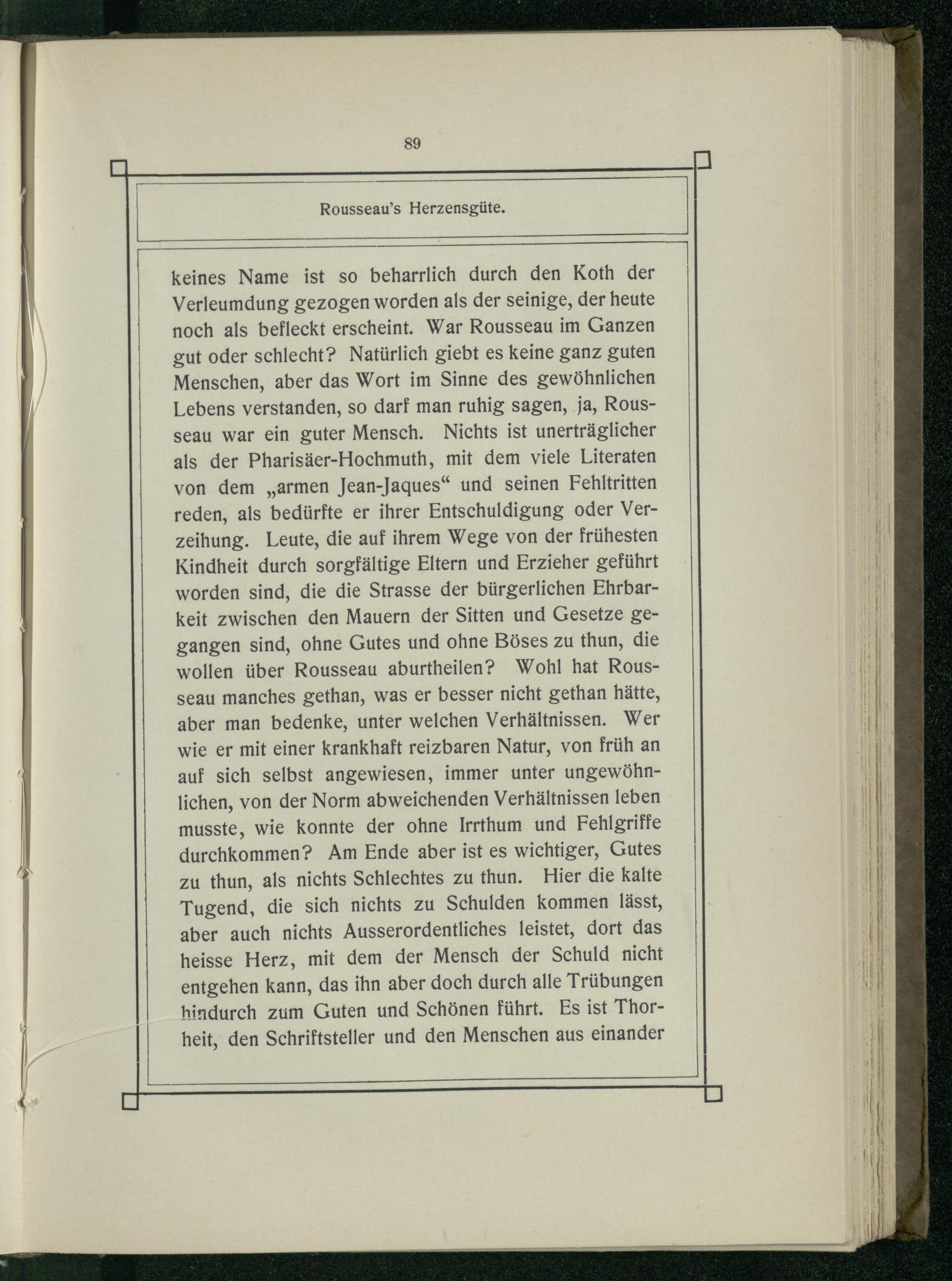 keines Name ist so beharrlich durch den Koth der Verleumdung gezogen worden als der seinige, der heute noch als befleckt erscheint. War Rousseau im Ganzen gut oder schlecht? Natürlich giebt es keine ganz guten Menschen, aber das Wort im Sinne des gewöhnlichen Lebens verstanden, so darf man ruhig sagen, ja, Rousseau war ein guter Mensch. Nichts ist unerträglicher als der Pharisäer-Hochmuth, mit dem viele Literaten von dem„armen Jean-Jaques“ und seinen Fehltritten reden, als bedürfte er ihrer Entschuldigung oder Verzeihung. Leute, die auf ihrem Wege von der frühesten Kindheit durch sorgfältige Eltern und Erzieher geführt worden sind, die die Strasse der bürgerlichen Ehrbarkeit zwischen den Mauern der Sitten und Gesetze gegangen sind, ohne Gutes und ohne Böses zu thun, die wollen über Rousseau aburtheilen? Wohl hat Rousseau manches gethan, was er besser nicht gethan hätte, aber man bedenke, unter welchen Verhältnissen. Wer wie er mit einer krankhaft reizbaren Natur, von früh an auf sich selbst angewiesen, immer unter ungewöhnlichen, von der Norm abweichenden Verhältnissen leben musste, wie konnte der ohne Irrthum und Fehlgriffe durchkommen? Am Ende aber ist es wichtiger, Gutes zu thun, als nichts Schlechtes zu thun. Hier die kalte Tugend, die sich nichts zu Schulden kommen lässt, aber auch nichts Ausserordentliches leistet, dort das heisse Herz, mit dem der Mensch der Schuld nicht entgehen kann, das ihn aber doch durch alle Trübungen hindurch zum Guten und Schönen führt. Es ist Thorheit, den Schriftsteller und den Menschen aus einander