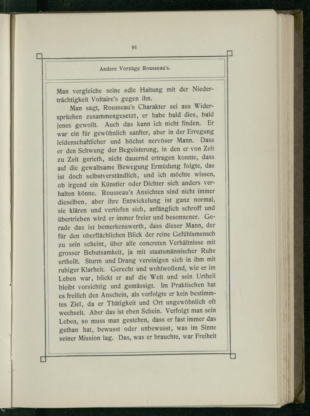 Man sagt, Rousseau’s Charakter sei aus Widersprüchen zusammengesetzt, Cr habe bald dies, bald jenes gewollt. Auch das kann ich nicht finden. Er war ein für gewöhnlich sanfter, aber in der Erregung leidenschaftlicher und höchst nervöser Mann. Dass er den Schwung der Begeisterung, in den er von Zeit zu Zeit gerieth, nicht dauernd ertragen konnte, dass auf die gewaltsame Bewegung Ermüdung folgte, das ist doch selbstverständlich, und ich möchte wissen, ob irgend ein Künstler oder Dichter sich anders verhalten könne. Rousseau’s Ansichten sind nicht immer dieselben, aber ihre Entwickelung ist ganz normal, sie klären und vertiefen sich, anfänglich schroff und übertrieben wird er immer freier und besonnener. Gerade das ist bemerkenswerth, dass dieser Mann, der für den oberflächlichen Blick der reine Gefühlsmensch zu sein scheint, über alle concreten Verhältnisse mit grosser Behutsamkeit, ja mit staatsmännischer Ruhe urtheilt. Sturm und Drang vereinigen sich in ihm mit ruhiger Klarheit. Gerecht und wohlwollend, wie er im Leben war, blickt er auf die Welt und sein Urtheil bleibt vorsichtig und gemässigt. Im Praktischen hat es freilich den Anschein, als verfolgte er kein bestimmtes Ziel, da er Thätigkeit und Ort ungewöhnlich oft wechselt. Aber das ist eben Schein. Verfolgt man sein Leben, so muss man gestehen, dass er fast immer das gethan hat, bewusst oder unbewusst, Was im Sinne seiner Mission lag. Das, was er brauchte, war Freiheit