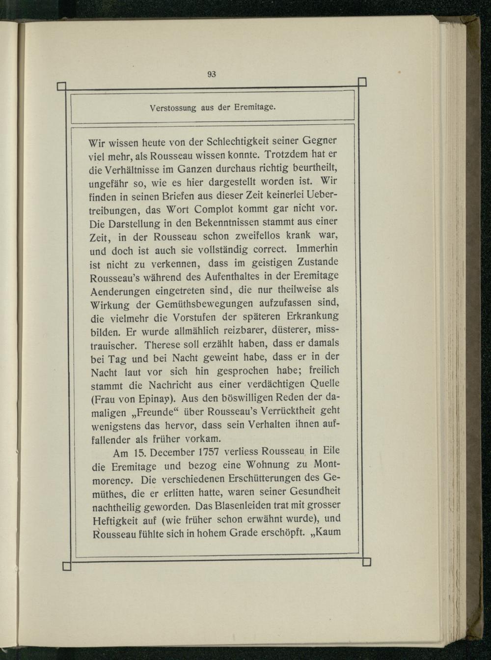Wir wissen heute von der Schlechtigkeit seiner Gegner viel mehr, als Rousseau wissen konnte. Trotzdem hat er die Verhältnisse im Ganzen durchaus richtig beurtheilt, ungefähr so, wie es hier dargestellt worden ist. Wir finden in seinen Briefen aus dieser Zeit keinerlei Uebertreibungen, das Wort Complot kommt gar nicht vor. Die Darstellung in den Bekenntnissen stammt aus einer Zeit, in der Rousseau schon zweifellos krank war, und doch ist auch sie vollständig correct. Immerhin ist nicht zu verkennen, dass im geistigen Zustande Rousseau’s während des Aufenthaltes in der Eremitage Aenderungen eingetreten sind, die nur theilweise als Wirkung der Gemüthsbewegungen aufzufassen sind, die vielmehr die Vorstufen der späteren Erkrankung bilden. Er wurde allmählich reizbarer, düsterer, misstrauischer. Therese soll erzählt haben, dass er damals bei Tag und bei Nacht geweint habe, dass er in der Nacht laut vor sich hin gesprochen habe; freilich stammt die Nachricht aus einer verdächtigen Quelle (Frau von Epinay). Aus den böswilligen Reden der damaligen„Freunde“ über Rousseau’s Verrücktheit geht wenigstens das hervor, dass sein Verhalten ihnen auffallender als früher vorkam.