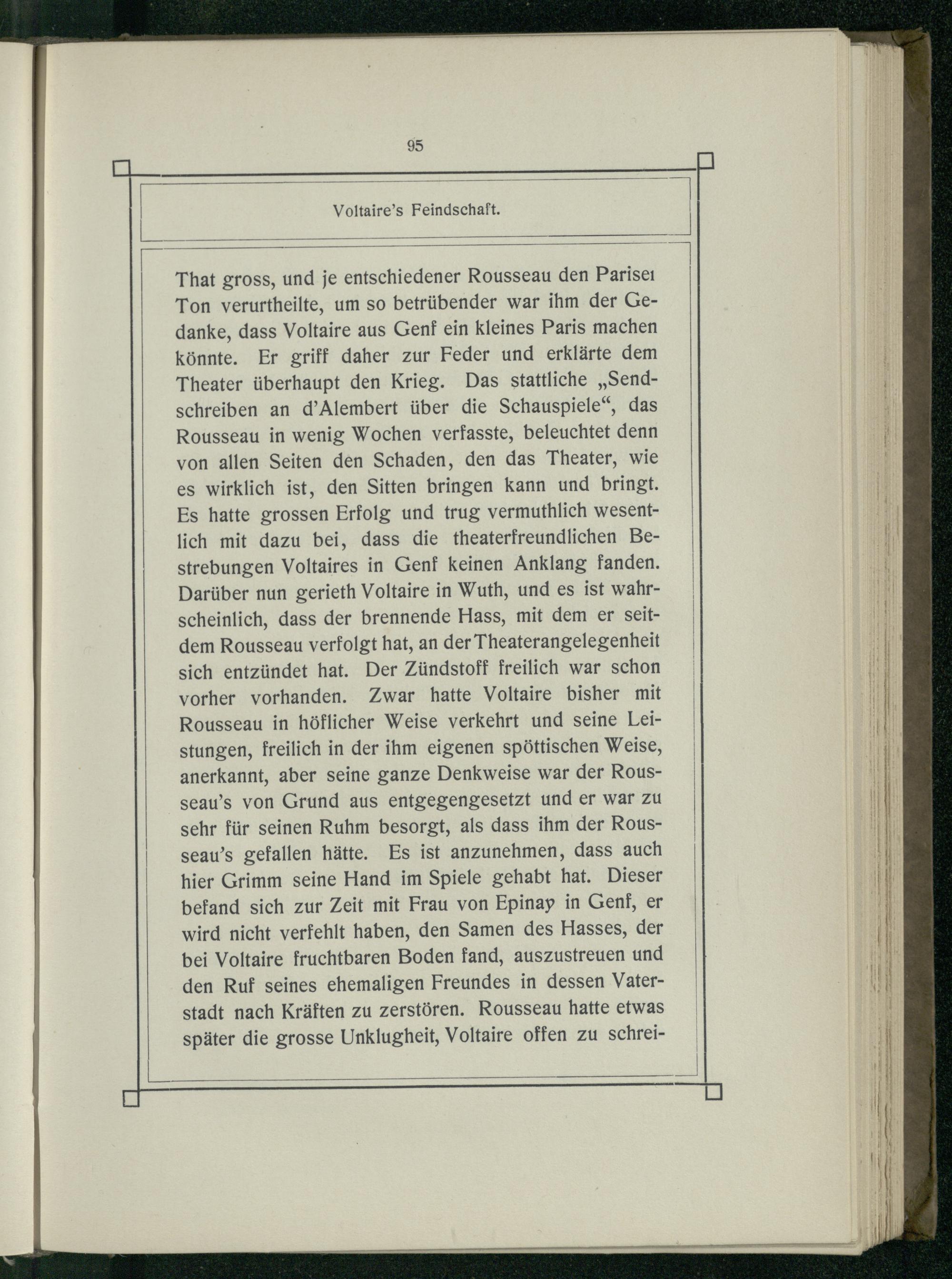 That gross, und je entschiedener Rousseau den Parise1i | Ton verurtheilte, um so betrübender war ihm der Gedanke, dass Voltaire aus Genf ein kleines Paris machen| könnte. Er griff daher zur Feder und erklärte dem Theater überhaupt den Krieg. Das stattliche„Sendschreiben an d’Alembert über die Schauspiele“, das Rousseau in wenig Wochen verfasste, beleuchtet denn von allen Seiten den Schaden, den das Theater, wie es wirklich ist, den Sitten bringen kann und bringt. Es hatte grossen Erfolg und trug vermuthlich wesentlich mit dazu bei, dass die theaterfreundlichen Bestrebungen Voltaires in Genf keinen Anklang fanden. Darüber nun gerieth Voltaire in Wuth, und es ist wahrscheinlich, dass der brennende Hass, mit dem er seitdem Rousseau verfolgt hat, an der Theaterangelegenheit sich entzündet hat. Der Zündstoff freilich war schon vorher vorhanden. Zwar hatte Voltaire bisher mit Rousseau in höflicher Weise verkehrt und seine Leistungen, freilich in der ihm eigenen spöttischen Weise, anerkannt, aber seine ganze Denkweise war der Rousseau’s von Grund aus entgegengesetzt und er war zu sehr für seinen Ruhm besorgt, als dass ihm der Rousseau’s gefallen hätte. Es ist anzunehmen, dass auch hier Grimm seine Hand im Spiele gehabt hat. Dieser befand sich zur Zeit mit Frau von Epinap in Genf, er wird nicht verfehlt haben, den Samen des Hasses, der bei Voltaire fruchtbaren Boden fand, auszustreuen und den Ruf seines ehemaligen Freundes in dessen Vaterstadt nach Kräften zu zerstören. Rousseau hatte etwas später die grosse Unklugheit, Voltaire offen zu schrei