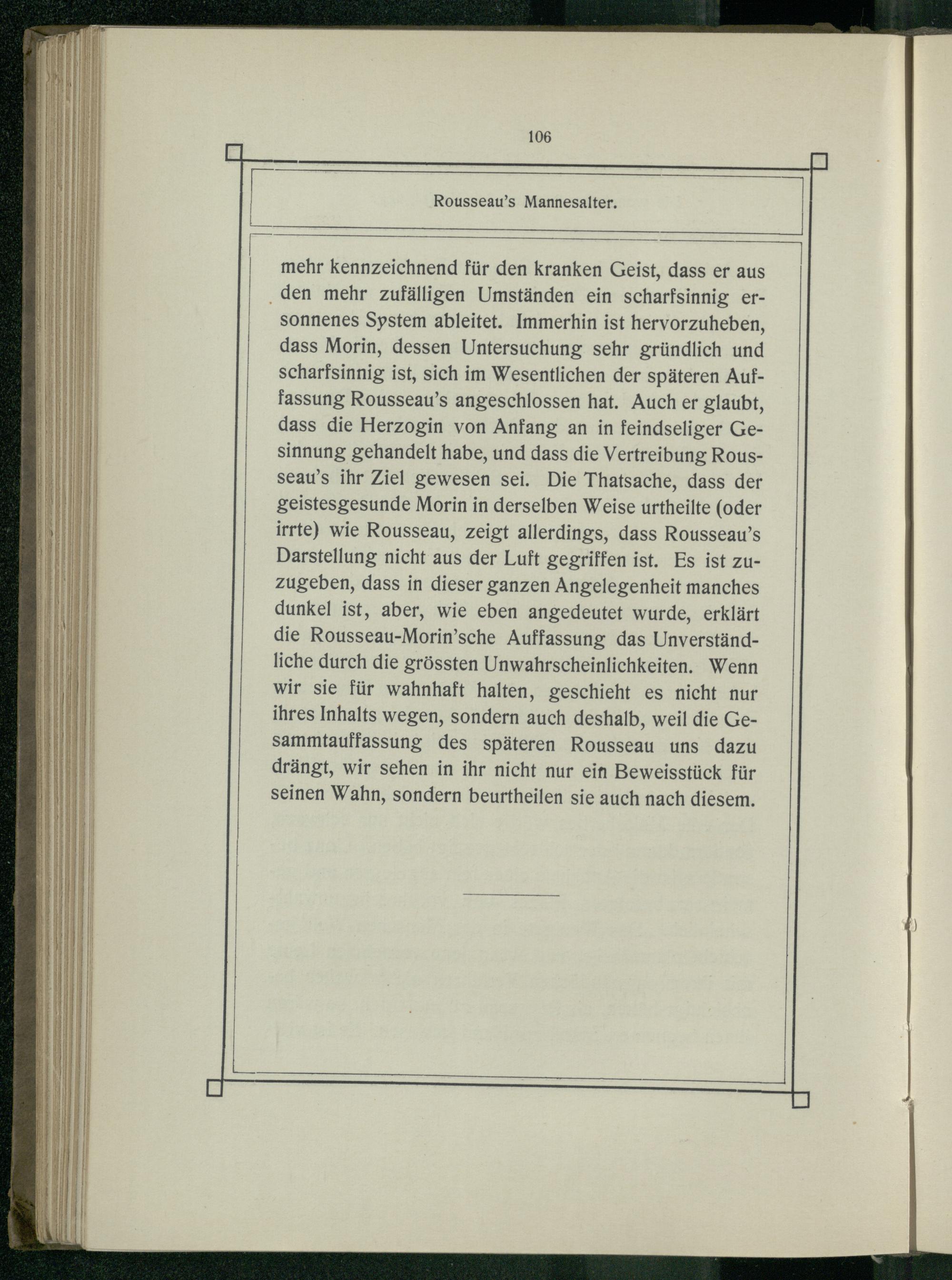 mehr kennzeichnend für den kranken Geist, dass er aus ‚den mehr zufälligen Umständen ein scharfsinnig ersonnenes System ableitet. Immerhin ist hervorzuheben, dass Morin, dessen Untersuchung sehr gründlich und scharfsinnig ist, sich im Wesentlichen der späteren Auffassung Rousseau’s angeschlossen hat. Auch er glaubt, dass die Herzogin von Anfang an in feindseliger Gesinnung gehandelt habe, und dass die Vertreibung Rousseau’s ihr Ziel gewesen sei. Die Thatsache, dass der geistesgesunde Morin in derselben Weise urtheilte(oder irrte) wie Rousseau, zeigt allerdings, dass Rousseau’s Darstellung nicht aus der Luft gegriffen ist. Es ist zuzugeben, dass in dieser ganzen Angelegenheit manches dunkel ist, aber, wie eben angedeutet wurde, erklärt die Rousseau-Morin’sche Auffassung das Unverständliche durch die grössten Unwahrscheinlichkeiten. Wenn wir sie für wahnhaft halten, geschieht es nicht nur ihres Inhalts wegen, sondern auch deshalb, weil die Gesammtauffassung des späteren Rousseau uns dazu drängt, wir sehen in ihr nicht nur ein Beweisstück für seinen Wahn, sondern beurtheilen sie auch nach diesem.