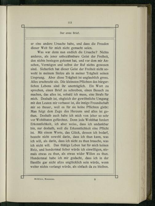 Was war denn nun endlich die Ursache? Nichts anderes, als jener unbezähmbare Geist der Freiheit, den nichts besiegen gekonnt hat, und vor dem mir Ansehen, Vermögen und selbst der Ruf nichts gewesen sind. Sicherlich hat dieser Geist der Freiheit nicht sowohl in meinem Stolze als in meiner Trägheit seinen Ursprung. Aber diese Trägheit ist unglaublich gross. Alles erschreckt sie. Die kleinsten Pflichten des bürgerlichen Lebens sind ihr unerträglich. Ein Wort zu sprechen, einen Brief zu schreiben, einen Besuch zu machen, das alles ist, sobald ich muss, eine Strafe für mich. Deshalb ist, obgleich der gewöhnliche Umgang mit den Leuten mir verhasst ist, die innige Freundschaft mir so theuer, weil es für sie keine Pflichten giebt: Man folgt dem Zuge des Herzens und alles ist gethan. Deshalb auch habe ich mich von jeher so sehr vor Wohlthaten gefürchtet. Denn jede Wohlthat fordert Erkenntlichkeit, ich aber weiss, dass ich undankbar bin, nur deshalb, weil die Erkenntlichkeit eine Pflicht ist. Mit einem Worte, das Glück, dessen ich bedarf, besteht nicht sowohl darin, dass ich thun kann, was ich will, als darin, dass ich nicht zu thun brauche, was ich nicht will. Das thätige Leben hat für mich keinen Reiz, und hundertmal lieber würde ich einwilligen, niemals etwas zu thun, als etwas wider Willen zu thun. Hundertmal habe ich mir gedacht, dass ich in der Bastille gar nicht allzu unglücklich sein würde, wenn weiter nichts verlangt würde, als einfach da zu bleiben.