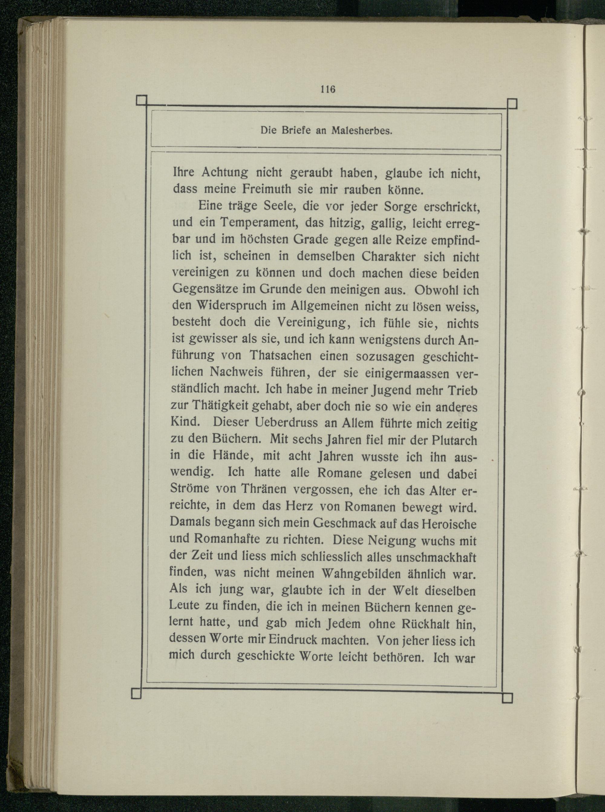 Eine träge Seele, die vor jeder Sorge erschrickt, und ein Temperament, das hitzig, gallig, leicht erregbar und im höchsten Grade gegen alle Reize empfindlich ist, scheinen in demselben Charakter sich nicht vereinigen zu können und doch machen diese beiden Gegensätze im Grunde den meinigen aus. Obwohl ich den Widerspruch im Allgemeinen nicht zu lösen weiss, besteht doch die Vereinigung, ich fühle sie, nichts ist gewisser als sie, und ich kann wenigstens durch Anführung von Thatsachen einen sozusagen geschichtlichen Nachweis führen, der sie einigermaassen verständlich macht. Ich habe in meiner Jugend mehr Trieb zur Thätigkeit gehabt, aber doch nie so wie ein anderes Kind. Dieser Ueberdruss an Allem führte mich zeitig zu den Büchern. Mit sechs Jahren fiel mir der Plutarch in die Hände, mit acht Jahren wusste ich ihn auswendig. Ich hatte alle Romane gelesen und dabei Ströme von Thränen vergossen, ehe ich das Alter erreichte, in dem das Herz von Romanen bewegt wird. Damals begann sich mein Geschmack auf das Heroische und Romanhafte zu richten. Diese Neigung wuchs mit der Zeit und liess mich schliesslich alles unschmackhaft finden, was nicht meinen Wahngebilden ähnlich war. Als ich jung war, glaubte ich in der Welt dieselben Leute zu finden, die ich in meinen Büchern kennen gelernt hatte, und gab mich Jedem ohne Rückhalt hin, dessen Worte mir Eindruck machten. Von jeher liess ich mich durch geschickte Worte leicht bethören. Ich war
