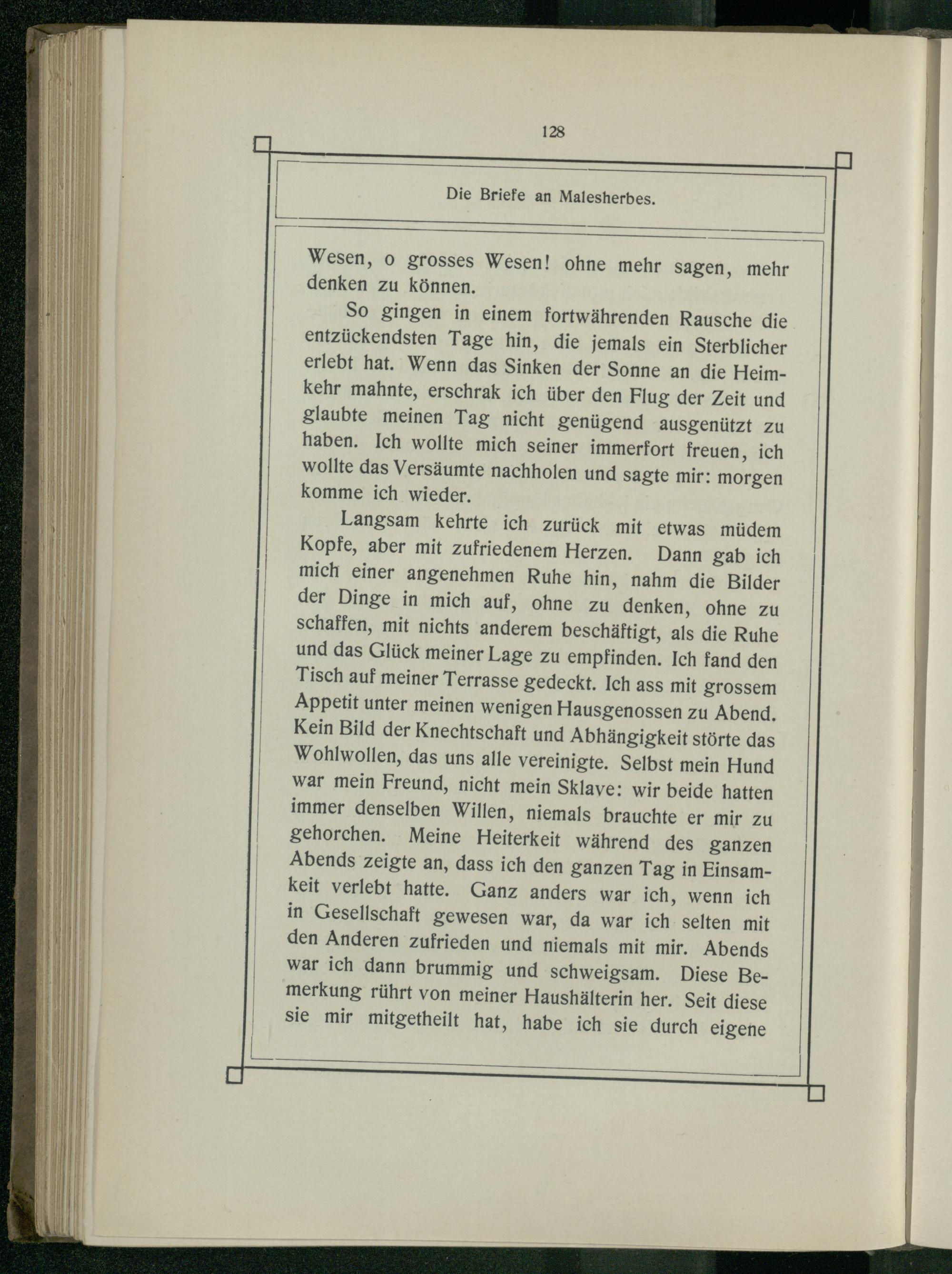 Langsam kehrte ich zurück mit etwas müdem Kopfe, aber mit zufriedenem Herzen. Dann gab ich mich einer angenehmen Ruhe hin, nahm die Bilder der Dinge in mich auf, ohne zu denken, ohne zu schaffen, mit nichts anderem beschäftigt, als die Ruhe und das Glück meiner Lage zu empfinden. Ich fand den Tisch auf meiner Terrasse gedeckt. Ich ass mit grossem Appetit unter meinen wenigen Hausgenossen zu Abend. Kein Bild der Knechtschaft und Abhängigkeit störte das Wohlwollen, das uns alle vereinigte. Selbst mein Hund war mein Freund, nicht mein Sklave: wir beide hatten immer denselben Willen, niemals brauchte er mir zu gehorchen. Meine Heiterkeit während des ganzen Abends zeigte an, dass ich den ganzen Tag in Einsamkeit verlebt hatte. Ganz anders war ich, wenn ich in Gesellschaft gewesen war, da war ich. selten mit den Anderen zufrieden und niemals mit mir. Abends war ich dann brummig und schweigsam. Diese Bemerkung rührt von meiner Haushälterin her. Seit diese sie mir mitgetheilt hat, habe ich sie durch eigene