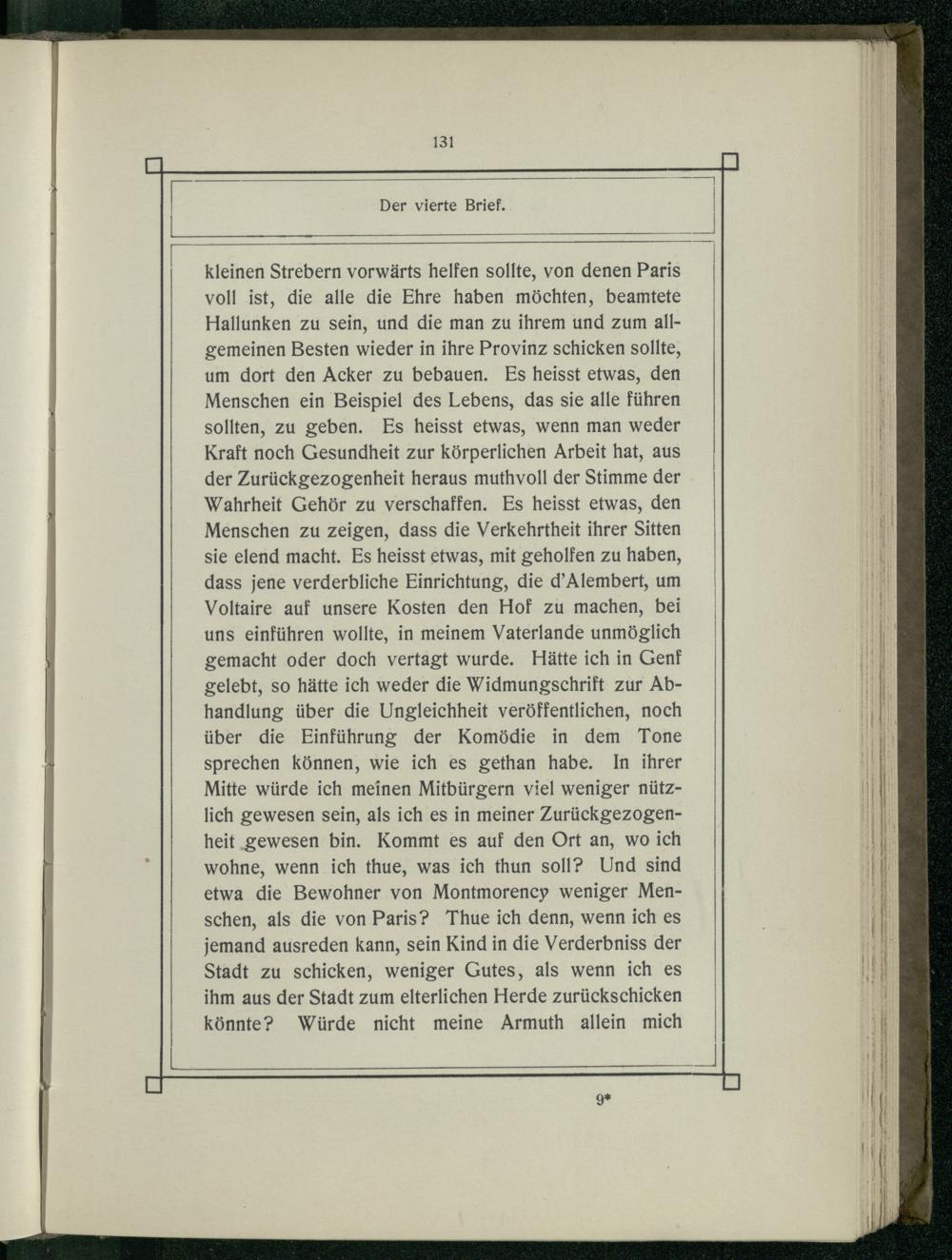 kleinen Strebern vorwärts helfen sollte, von denen Paris voll ist, die alle die Ehre haben möchten, beamtete Hallunken zu sein, und die man zu ihrem und zum allgemeinen Besten wieder in ihre Provinz schicken sollte, um dort den Acker zu bebauen. Es heisst etwas, den Menschen ein Beispiel des Lebens, das sie alle führen sollten, zu geben. Es heisst etwas, wenn man weder Kraft noch Gesundheit zur körperlichen Arbeit hat, aus der Zurückgezogenheit heraus muthvoll der Stimme der Wahrheit Gehör zu verschaffen. Es heisst etwas, den Menschen zu zeigen, dass die Verkehrtheit ihrer Sitten sie elend macht. Es heisst etwas, mit geholfen zu haben, dass jene verderbliche Einrichtung, die d’Alembert, um Voltaire auf unsere Kosten den Hof zu machen, bei uns einführen wollte, in meinem Vaterlande unmöglich gemacht oder doch vertagt wurde. Hätte ich in Genf gelebt, so hätte ich weder die Widmungschrift zur Abhandlung über die Ungleichheit veröffentlichen, noch über die Einführung der Komödie in dem Tone sprechen können, wie ich es gethan habe. In ihrer Mitte würde ich meinen Mitbürgern viel weniger nützlich gewesen sein, als ich es in meiner Zurückgezogenheit ‚gewesen bin. Kommt es auf den Ort an, wo ich wohne, wenn ich thue, was ich thun soll? Und sind etwa die Bewohner von Montmorencp weniger Menschen, als die von Paris? Thue ich denn, wenn ich es jemand ausreden kann, sein Kind in die Verderbniss der Stadt zu schicken, weniger Gutes, als wenn ich es ihm aus der Stadt zum elterlichen Herde zurückschicken könnte? Würde nicht meine Armuth allein mich