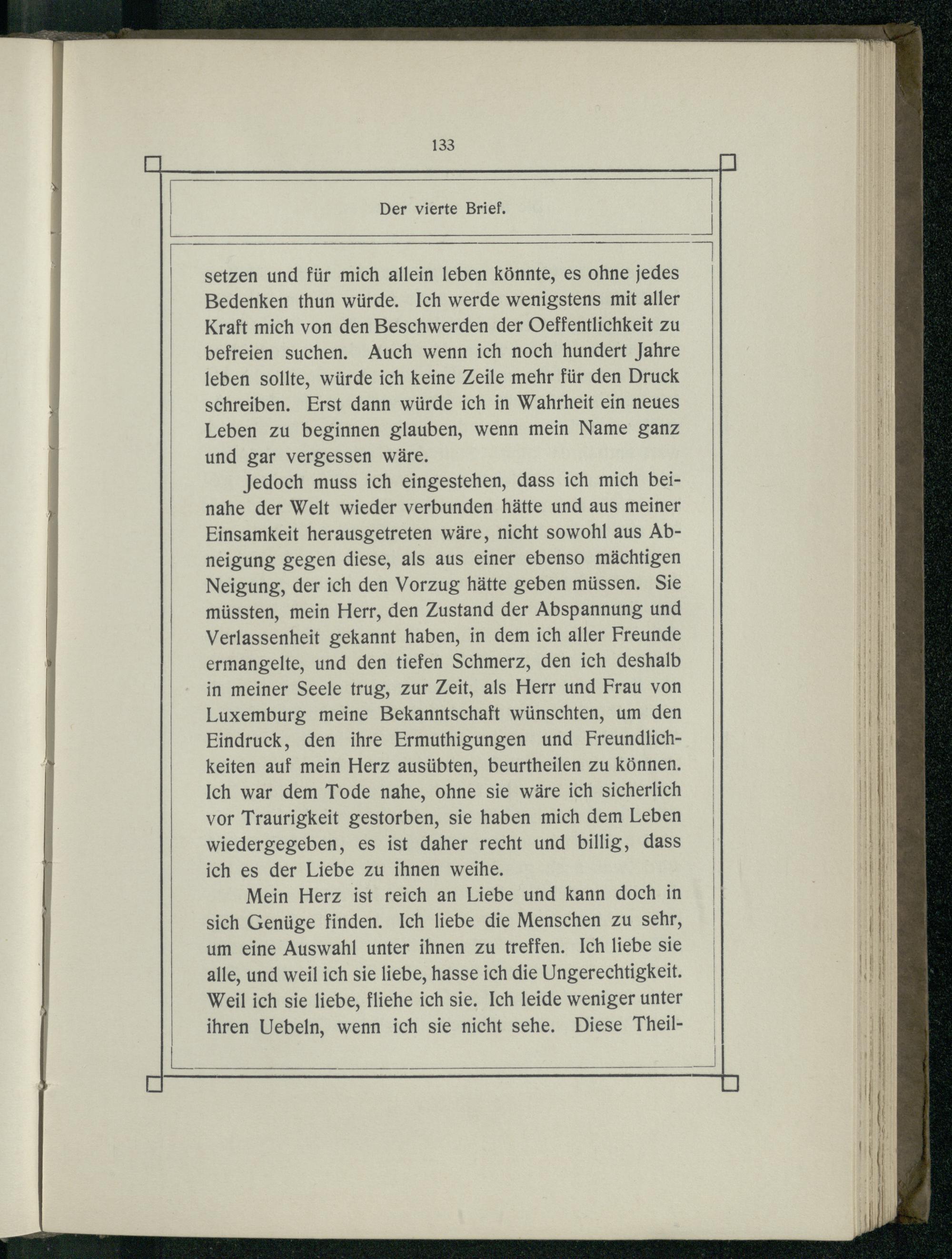 Jedoch muss ich eingestehen, dass ich mich beinahe der Welt wieder verbunden hätte und aus meiner Einsamkeit herausgetreten wäre, nicht sowohl aus Abneigung gegen diese, als aus einer ebenso mächtigen Neigung, der ich den Vorzug hätte geben müssen. Sie müssten, mein Herr, den Zustand der Abspannung und Verlassenheit gekannt haben, in dem ich aller Freunde ermangelte, und den tiefen Schmerz, den ich deshalb in meiner Seele trug, zur Zeit, als Herr und Frau von Luxemburg meine Bekanntschaft wünschten, um den Eindruck, den ihre Ermuthigungen und Freundlichkeiten auf mein Herz ausübten, beurtheilen zu können. Ich war dem Tode nahe, ohne sie wäre ich sicherlich vor Traurigkeit gestorben, sie haben mich dem Leben wiedergegeben, es ist daher recht und billig, dass ich es der Liebe zu ihnen weihe.