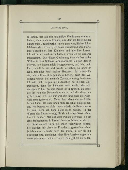 ja Ihnen, der Sie mir unzählige Wohlthaten erwiesen haben, ohne mich zu kennen, und dem ich trotz meiner natürlichen Undankbarkeit mich gern verpflichtet fühle, Ich hasse die Grossen, ich hasse ihren Stand, ihre Härte, ihre Vorurtheile, ihre Kleinheit und alle ihre Laster; ich würde sie noch mehr hassen, wenn ich sie weniger missachtete. Mit dieser Gesinnung kam ich fast wider Willen in das Schloss Montmorency: ich sah dessen Herren, sie haben mich liebgewonnen, und ich, mein Herr, ich liebe sie und werde sie lieben, so lange ich lebe, mit aller Kraft meines Herzens. Ich würde für sie, ich will nicht sagen mein Leben, denn das Geschenk würde bei meinem Zustande wenig bedeuten, ich will nicht sagen mein Ansehen bei meinen Zeitgenossen, denn das kümmert mich wenig, aber den einzigen Ruhm, der mir theuer ist, hingeben, die Ehre, die ich von der Nachwelt erwarte, und die diese mir geben wird, weil sie mir gebührt und weil die Nachwelt stets gerecht ist. Mein Herz, das nicht zur Hälfte lieben kann, hat sich ihnen ohne Rückhalt hingegeben, und ich bereue es nicht; auch würde die Reue zwecklos sein, denn ich kann nicht mehr zurück. In der Wärme der Begeisterung, die sie mir eingeflösst haben, bin ich hundert Mal auf dem Punkte gewesen, sie um eine Zufluchtstätte in ihrem Hause zu bitten, an der ich den Rest meiner Tage bei ihnen verbringen könnte. Sie würden mir diese mit Freuden zugestanden haben, ja ich muss vielleicht nach der Weise, in der sie mir begegnet sind, annehmen, dass ihre Anerbietungen mir zuvorgekommen seien. Dieser Plan gehört zu denen,
