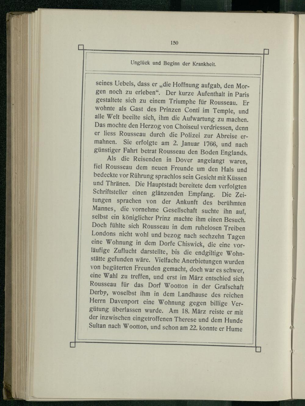 seines Uebels, dass er„die Hoffnung aufgab, den Morgen noch zu erleben“. Der kurze Aufenthalt in Paris gestaltete sich zu einem Triumphe für Rousseau. Er wohnte als Gast des Prinzen Conti im Temple, und alle Welt beeilte sich, ihm die Aufwartung zu machen. Das mochte den Herzog von Choiseul verdriessen, denn er liess Rousseau durch die Polizei zur Abreise ermahnen. Sie erfolgte am 2. Januar 1766, und nach günstiger Fahrt betrat Rousseau den Boden Englands.