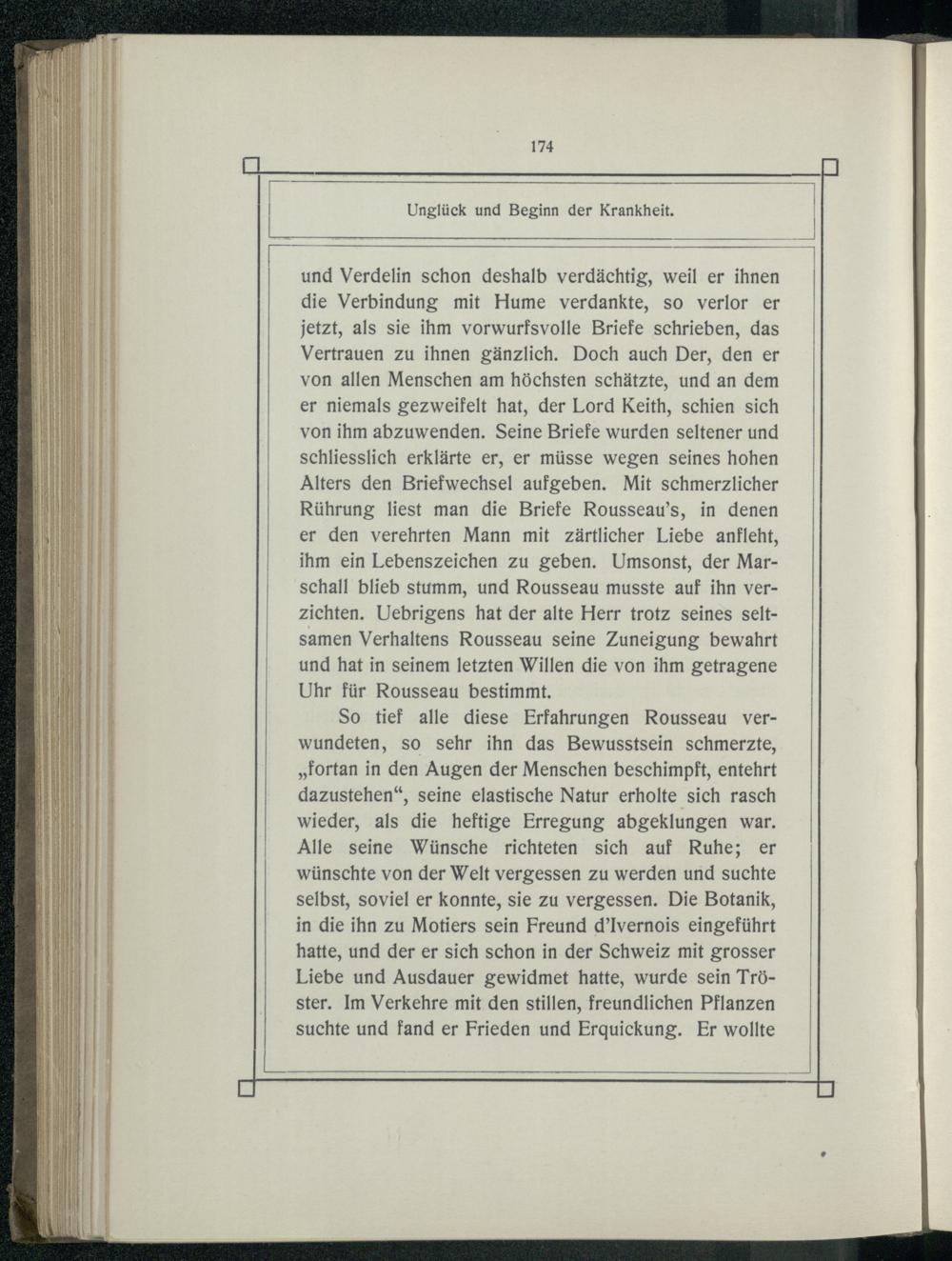 und Verdelin schon deshalb verdächtig, weil er ihnen die Verbindung mit Hume verdankte, so verlor er jetzt, als sie ihm vorwurfsvolle Briefe schrieben, das Vertrauen zu ihnen gänzlich. Doch auch Der, den er von allen Menschen am höchsten schätzte, und an dem er niemals gezweifelt hat, der Lord Keith, schien sich von ihm abzuwenden. Seine Briefe wurden seltener und schliesslich erklärte er, er müsse wegen seines hohen Alters den Briefwechsel aufgeben. Mit schmerzlicher Rührung liest man die Briefe Rousseau’s, in denen er den verehrten Mann mit zärtlicher Liebe anfleht, ihm ein Lebenszeichen zu geben. Umsonst, der Marschall blieb stumm, und Rousseau musste auf ihn verzichten. Uebrigens hat der alte Herr trotz seines seltsamen Verhaltens Rousseau seine Zuneigung bewahrt und hat in seinem letzten Willen die von ihm getragene Uhr für Rousseau bestimmt.