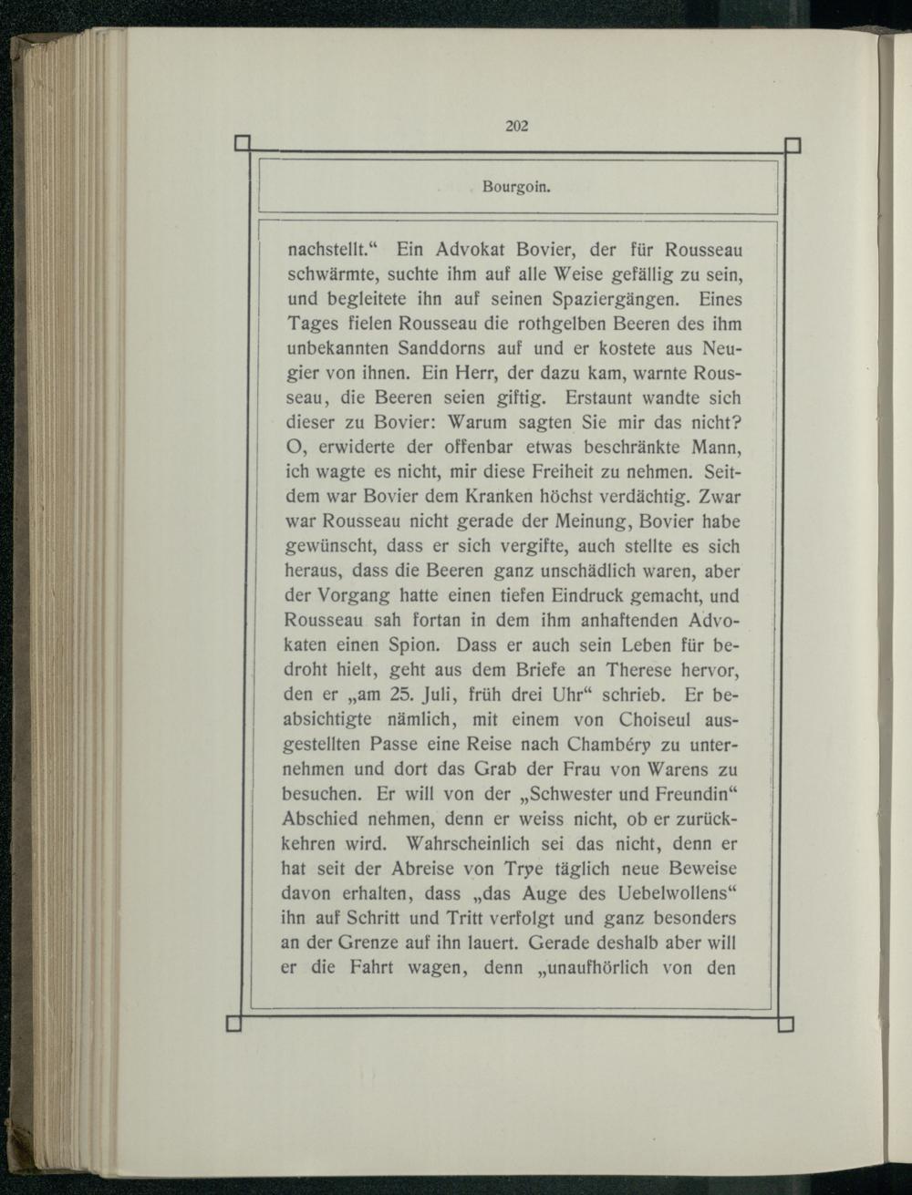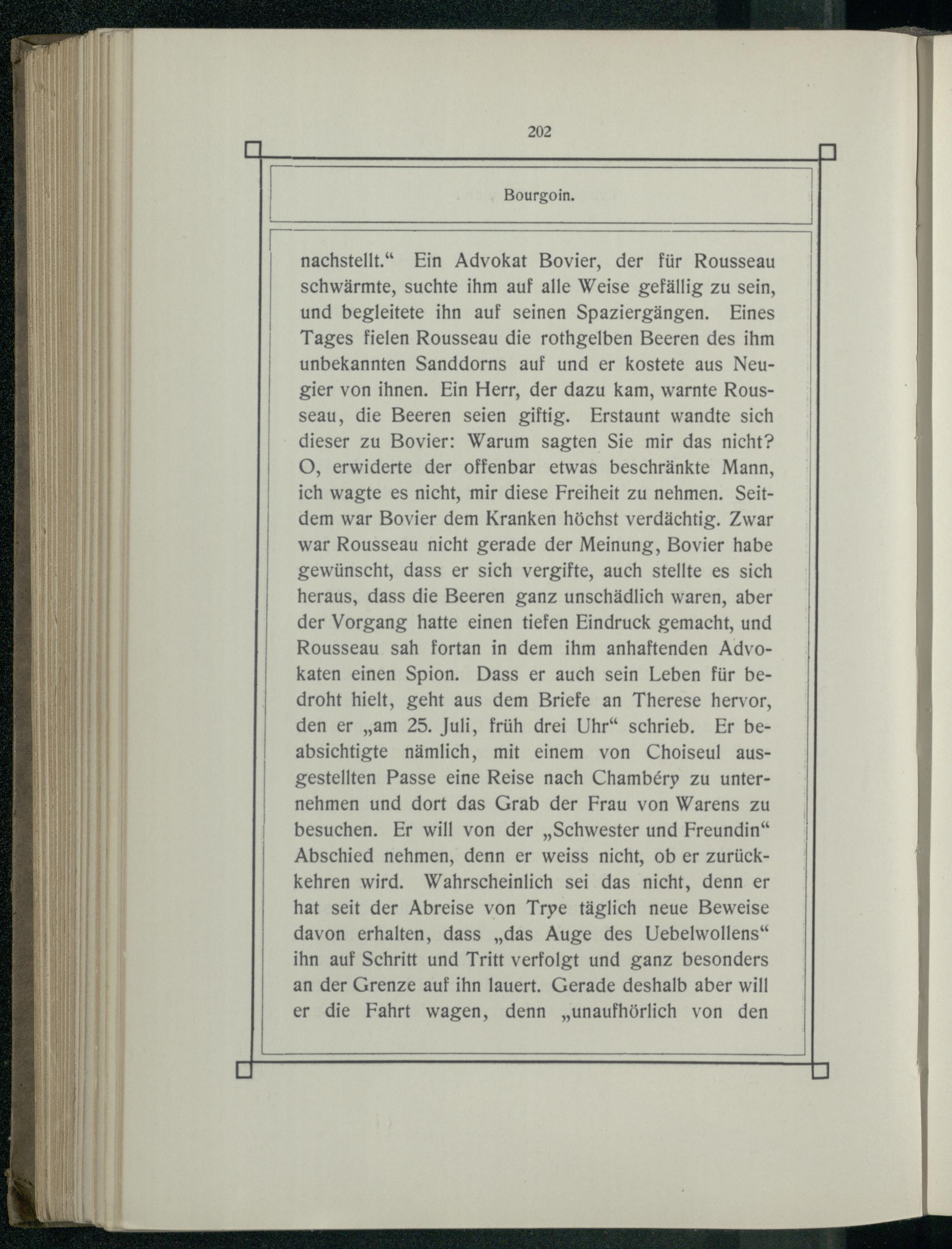 nachstellt.“ Ein Advokat Bovier, der für Rousseau schwärmte, suchte ihm auf alle Weise gefällig zu sein, und begleitete ihn auf seinen Spaziergängen. Eines Tages fielen Rousseau die rothgelben Beeren des ihm unbekannten Sanddorns auf und er kostete aus Neugier von ihnen. Ein Herr, der dazu kam, warnte Rousseau, die Beeren seien giftig. Erstaunt wandte sich dieser zu Bovier: Warum sagten Sie mir das nicht? O, erwiderte der offenbar etwas beschränkte Mann, ich wagte es nicht, mir diese Freiheit zu nehmen. Seitdem war Bovier dem Kranken höchst verdächtig. Zwar war Rousseau nicht gerade der Meinung, Bovier habe gewünscht, dass er sich vergifte, auch stellte es sich heraus, dass die Beeren ganz unschädlich waren, aber der Vorgang hatte einen tiefen Eindruck gemacht, und Rousseau sah fortan in dem ihm anhaftenden Advokaten einen Spion. Dass er auch sein Leben für bedroht hielt, geht aus dem Briefe an Therese hervor, den er‘„am 25. Juli, früh drei Uhr“ schrieb, Er beabsichtigte nämlich, mit einem von Choiseul ausgestellten Passe eine Reise nach Chambery zu unternehmen und dort das Grab der Frau von Warens zu besuchen. Er will von der„Schwester und Freundin“ Abschied nehmen, denn er weiss nicht, ob er zurückkehren wird. Wahrscheinlich sei das nicht, denn er hat seit der Abreise von Trye täglich neue Beweise davon erhalten, dass„das Auge des Uebelwollens“ ihn auf Schritt und Tritt verfolgt und ganz besonders an der Grenze auf ihn lauert. Gerade deshalb aber will er die Fahrt wagen, denn„unaufhörlich von den