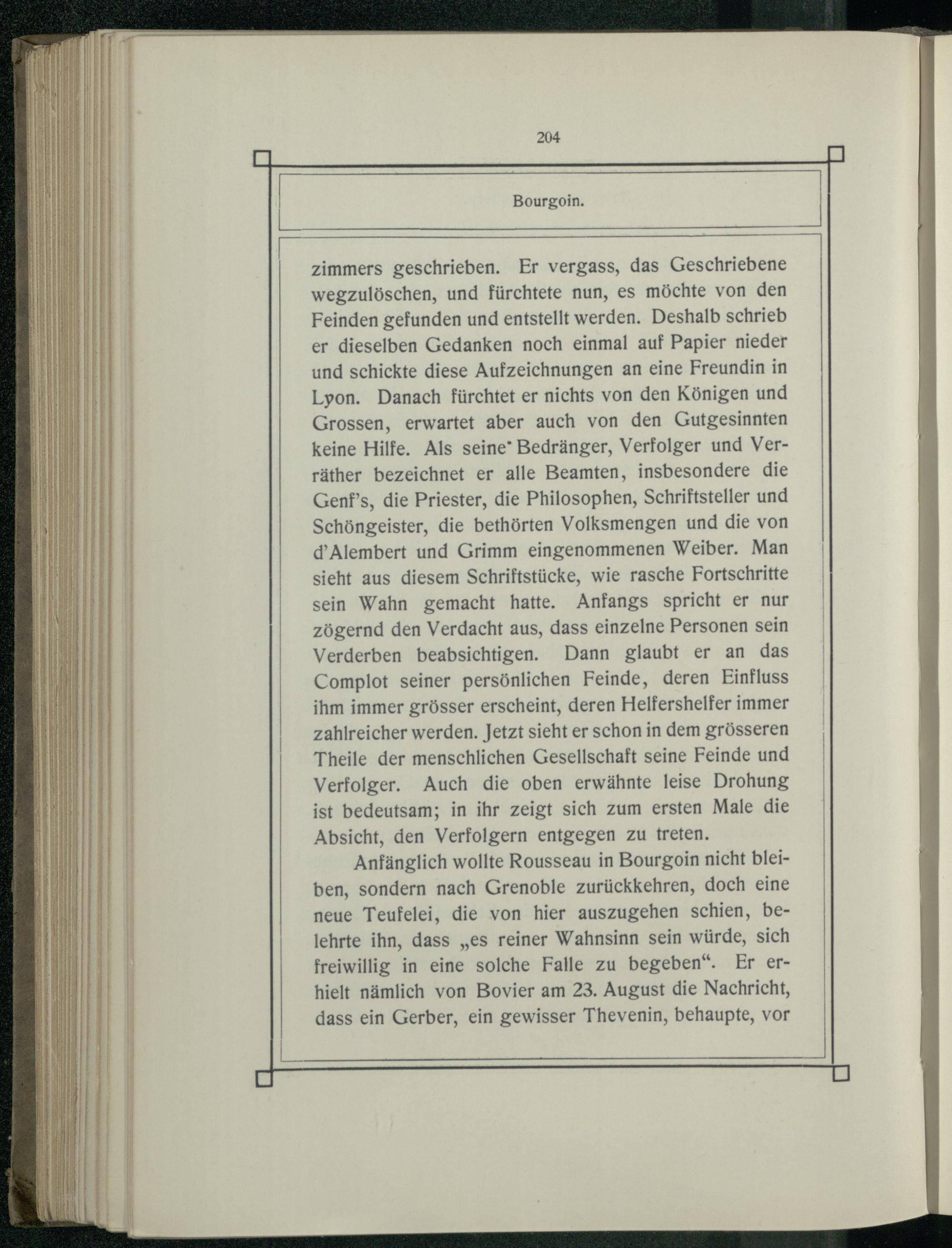 zimmers geschrieben. Er vergass, das Geschriebene wegzulöschen, und fürchtete nun, es möchte von den Feinden gefunden und entstellt werden. Deshalb schrieb er dieselben Gedanken noch einmal auf Papier nieder und schickte diese Aufzeichnungen an eine Freundin in Lyon. Danach fürchtet er nichts von den Königen und Grossen, erwartet aber auch von den Gutgesinnten keine Hilfe. Als seine’ Bedränger, Verfolger und Verräther bezeichnet er alle Beamten, insbesondere die Genf’s, die Priester, die Philosophen, Schriftsteller und Schöngeister, die bethörten Volksmengen und die von d’Alembert und Grimm eingenommenen Weiber. Man sieht aus diesem Schriftstücke, wie rasche Fortschritte sein Wahn gemacht hatte. Anfangs spricht er nur zögernd den Verdacht aus, dass einzelne Personen sein Verderben beabsichtigen. Dann glaubt er an das Complot seiner persönlichen Feinde, deren Einfluss ihm immer grösser erscheint, deren Helfershelfer immer zahlreicher werden. Jetzt sieht er schon in dem grösseren Theile der menschlichen Gesellschaft seine Feinde und Verfolger. Auch die oben erwähnte leise Drohung ist bedeutsam; in ihr zeigt sich zum ersten Male die Absicht, den Verfolgern entgegen zu treten. Anfänglich wollte Rousseau in Bourgoin nicht bleiben, sondern nach Grenoble zurückkehren, doch eine neue Teufelei, die von hier auszugehen schien, belehrte ihn, dass„es reiner Wahnsinn sein würde, sich freiwillig in eine solche Falle zu begeben“. Er erhielt nämlich von Bovier am 23. August die Nachricht, dass ein Gerber, ein gewisser Thevenin, behaupte, vor