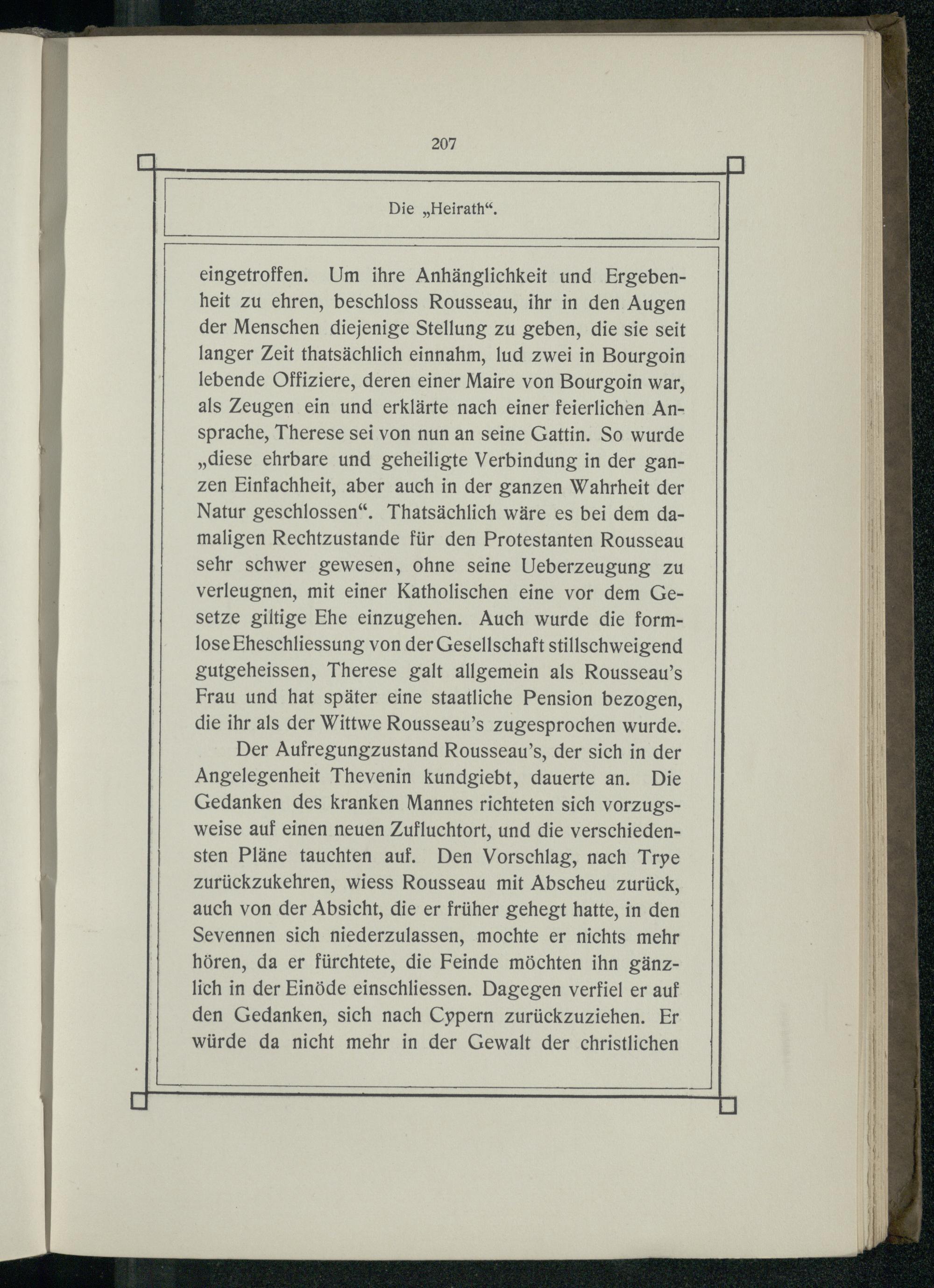 eingetroffen. Um ihre Anhänglichkeit und Ergebenheit zu ehren, beschloss Rousseau, ihr in den Augen der Menschen diejenige Stellung zu geben, die sie seit langer Zeit thatsächlich einnahm, lud zwei in Bourgoin lebende Offiziere, deren einer Maire von Bourgoin war, als Zeugen ein und erklärte nach einer feierlichen Ansprache, Therese sei von nun an seine Gattin. So wurde „diese ehrbare und geheiligte Verbindung in der ganzen Einfachheit, aber auch in der ganzen Wahrheit der Natur geschlossen“. Thatsächlich wäre es bei dem damaligen Rechtzustande für den Protestanten Rousseau sehr schwer gewesen, ohne seine Ueberzeugung zu verleugnen, mit einer Katholischen eine vor dem Gesetze giltige Ehe einzugehen. Auch wurde die formlose Eheschliessung von der Gesellschaft stillschweigend gutgeheissen, Therese galt allgemein als Rousseau’s Frau und hat später eine staatliche Pension bezogen, die ihr als der Wittwe Rousseau’s zugesprochen wurde.