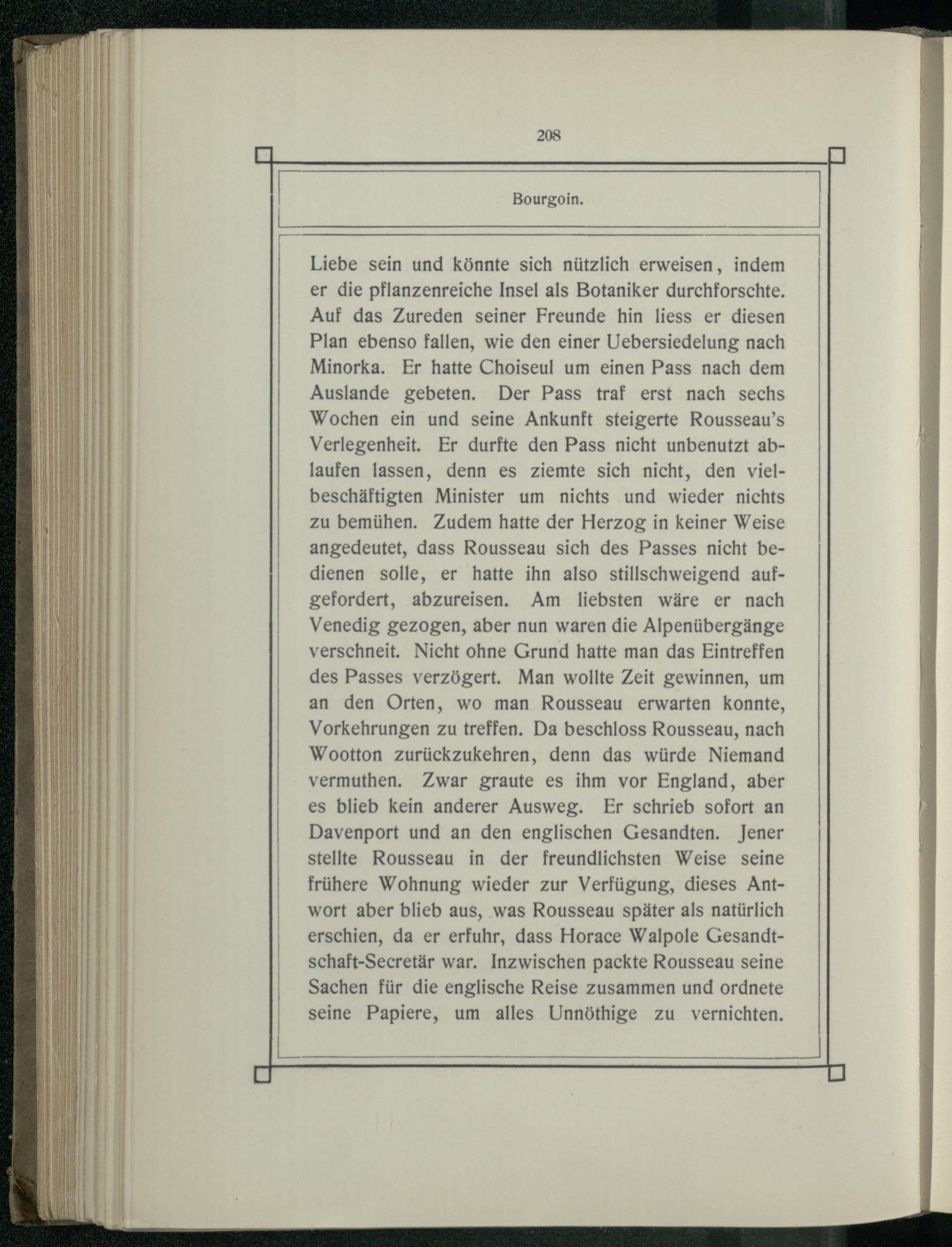Liebe sein und könnte sich nützlich erweisen, indem er die pflanzenreiche Insel als Botaniker durchforschte. Auf das Zureden seiner Freunde hin liess er diesen Plan ebenso fallen, wie den einer Uebersiedelung nach Minorka. Er hatte Choiseul um einen Pass nach dem Auslande gebeten. Der Pass traf erst nach sechs Wochen ein und seine Ankunft steigerte Rousseau’s Verlegenheit. Er durfte den Pass nicht unbenutzt ablaufen lassen, denn es ziemte sich nicht, den vielbeschäftigten Minister um nichts und wieder nichts zu bemühen. Zudem hatte der Herzog in keiner Weise angedeutet, dass Rousseau sich des Passes nicht bedienen solle, er hatte ihn also stillschweigend aufgefordert, abzureisen. Am liebsten wäre er nach Venedig gezogen, aber nun waren die Alpenübergänge verschneit. Nicht ohne Grund hatte man das Eintreffen des Passes verzögert. Man wollte Zeit gewinnen, um an den Orten, wo man Rousseau erwarten konnte, Vorkehrungen zu treffen. Da beschloss Rousseau, nach Wootton zurückzukehren, denn das würde Niemand vermuthen. Zwar graute es ihm vor England, aber es blieb kein anderer Ausweg. Er schrieb sofort an Davenport und an den englischen Gesandten. Jener stellte Rousseau in der freundlichsten Weise seine frühere Wohnung wieder zur Verfügung, dieses Antwort aber blieb aus, was Rousseau später als natürlich erschien, da er erfuhr, dass Horace Walpole Gesandtschaft-Secretär war. Inzwischen packte Rousseau seine Sachen für die englische Reise zusammen und ordnete seine Papiere, um alles Unnöthige zu vernichten.