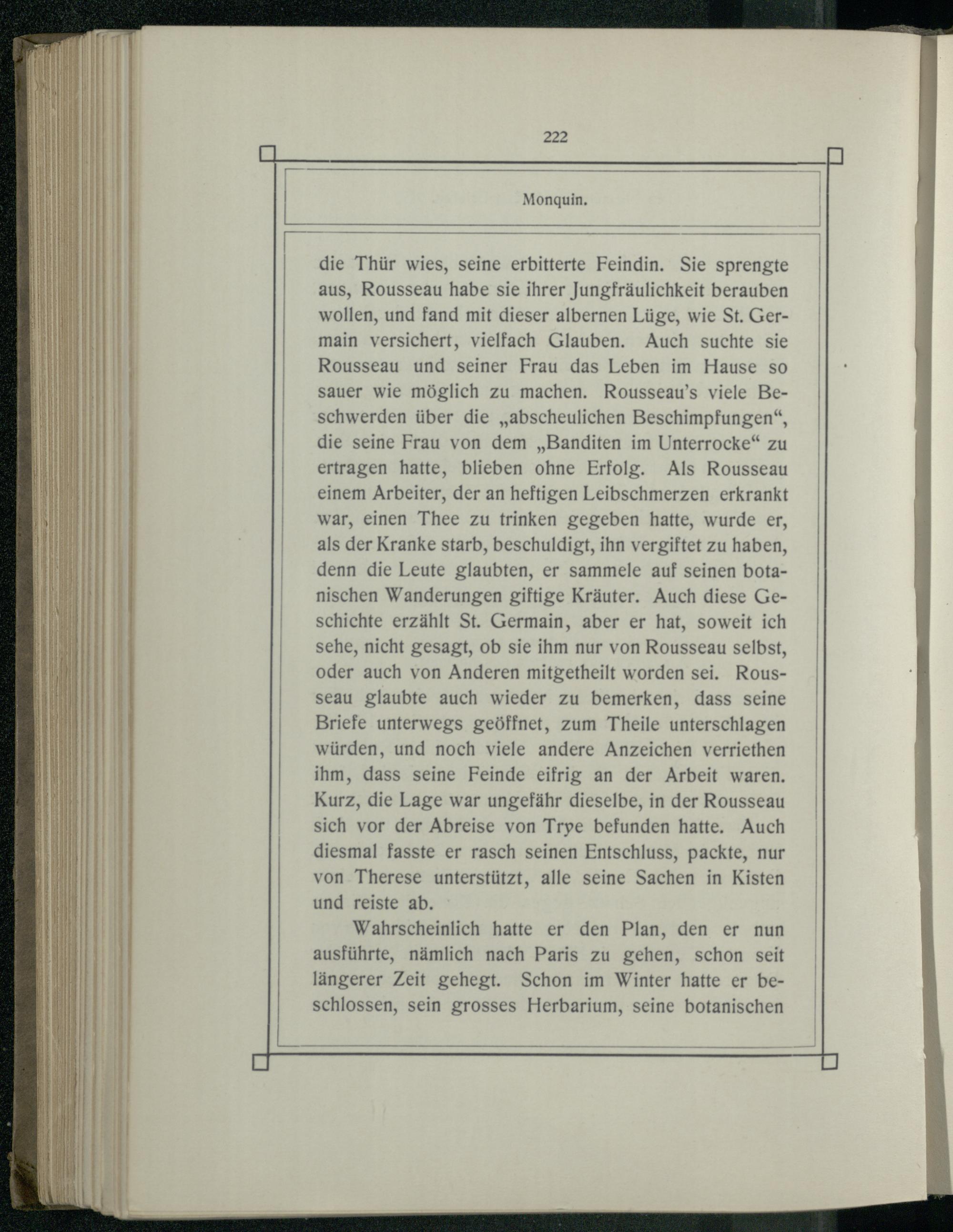 die Thür wies, seine erbitterte Feindin. Sie sprengte aus, Rousseau habe sie ihrer Jungfräulichkeit berauben wollen, und fand mit dieser albernen Lüge, wie St. Germain versichert, vielfach Glauben. Auch suchte sie Rousseau und seiner Frau das Leben im Hause so sauer wie möglich zu machen. Rousseau’s viele Beschwerden über die„abscheulichen Beschimpfungen“, die seine Frau von dem„Banditen im Unterrocke“ zu ertragen hatte, blieben ohne Erfolg. Als Rousseau einem Arbeiter, der an heftigen Leibschmerzen erkrankt war, einen Thee zu trinken gegeben hatte, wurde er, als der Kranke starb, beschuldigt, ihn vergiftet zu haben, denn die Leute glaubten, er sammele auf seinen botanischen Wanderungen giftige Kräuter. Auch diese Geschichte erzählt St. Germain, aber er hat, soweit ich sehe, nicht gesagt, ob sie ihm nur von Rousseau selbst, oder auch von Anderen mitgetheilt worden sei. Rousseau glaubte auch wieder zu bemerken, dass seine Briefe unterwegs geöffnet, zum Theile unterschlagen würden, und noch viele andere Anzeichen verriethen ihm, dass seine Feinde eifrig an der Arbeit waren. Kurz, die Lage war ungefähr dieselbe, in der Rousseau sich vor der Abreise von Trpye befunden hatte. Auch diesmal fasste er rasch seinen Entschluss, packte, nur von Therese unterstützt, alle seine Sachen in Kisten und reiste ab.